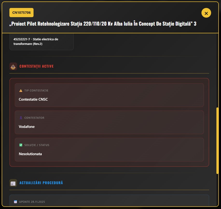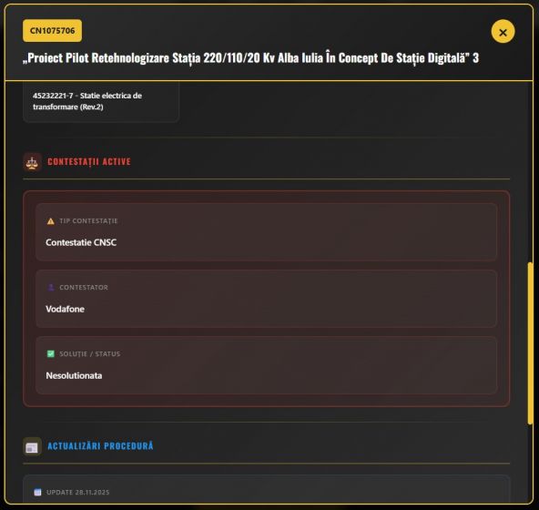 Pentru fiecare găsești detalii precum autoritatea contractantă, tipul procedurii, codurile CPV, dar și informații despre contestații. Cel din urmă e un aspect esențial, adesea ignorat, care explică de ce multe proiecte publice bat pasul pe loc.