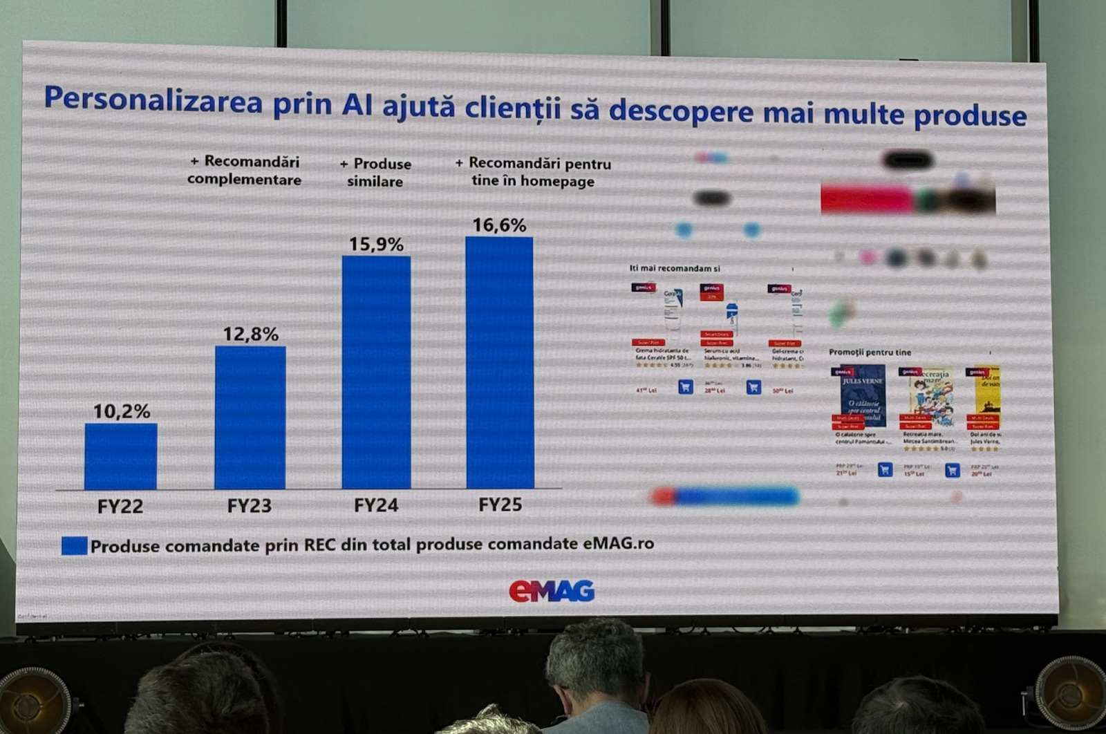 Cat de util e? În 2024, un client a achiziționat, în medie, 7 produse găsite prin metodele inteligente de căutare disponibile în platformă. De asemenea algoritmii AI îi ajută pe clienţi să descopere mai uşor produsele dorite şi prin recomandări personalizate au fost generate 16.6% din totalul de comenzi pe eMAG.