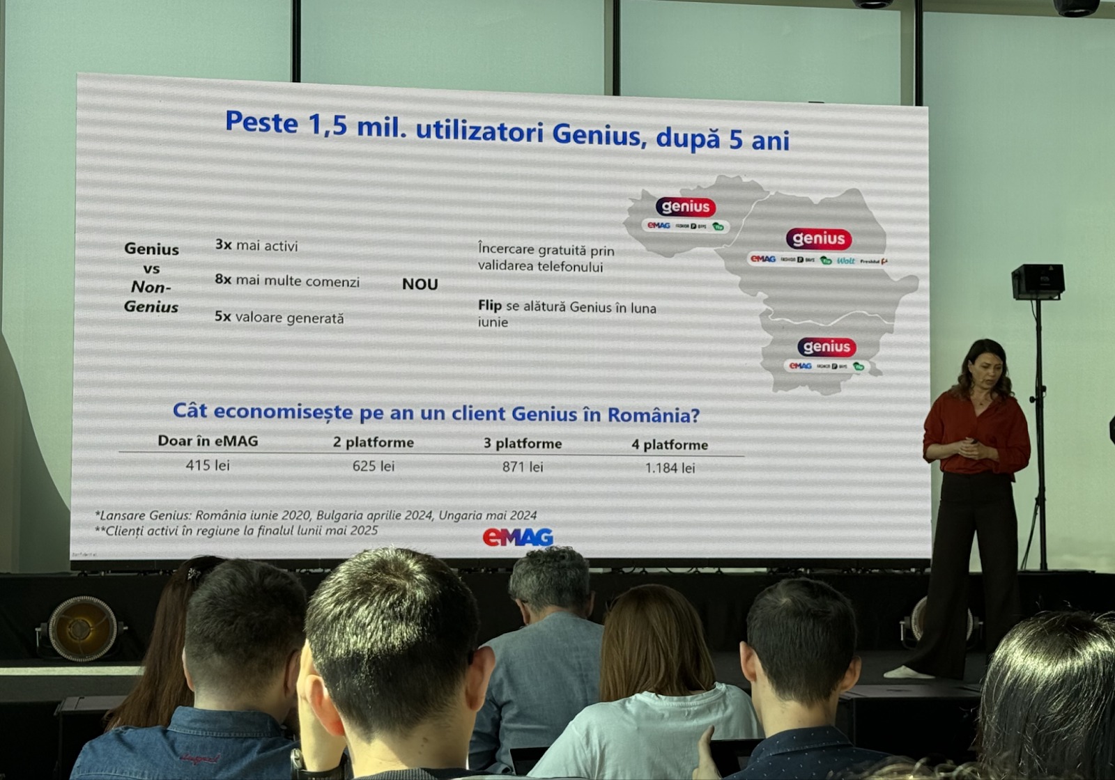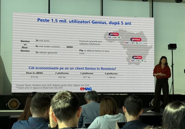 Exista acum 1.5 milioane de utilizatori Genius, după 5 ani şi o persoană care e client eMAG prin 4 platforme via Genius poate economisi în jur de 1100 lei pe an.