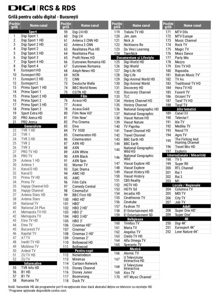 Cei care au televizoare fără profil DIGI sau mai vechi de anul 2014 vor trebui să facă o scanare manuală. Grila de programe din tabelul de mai jos are caracter orientativ şi poate suferi modificări, după realizarea ajustărilor tehnice necesare. Evident puteţi să ordonaţi canalele în ordinea dorită sau alfabetică, aşa cum doriţi pe TV. Mulți le lasă totuși așa, nu se obosesc sa le schimbe.