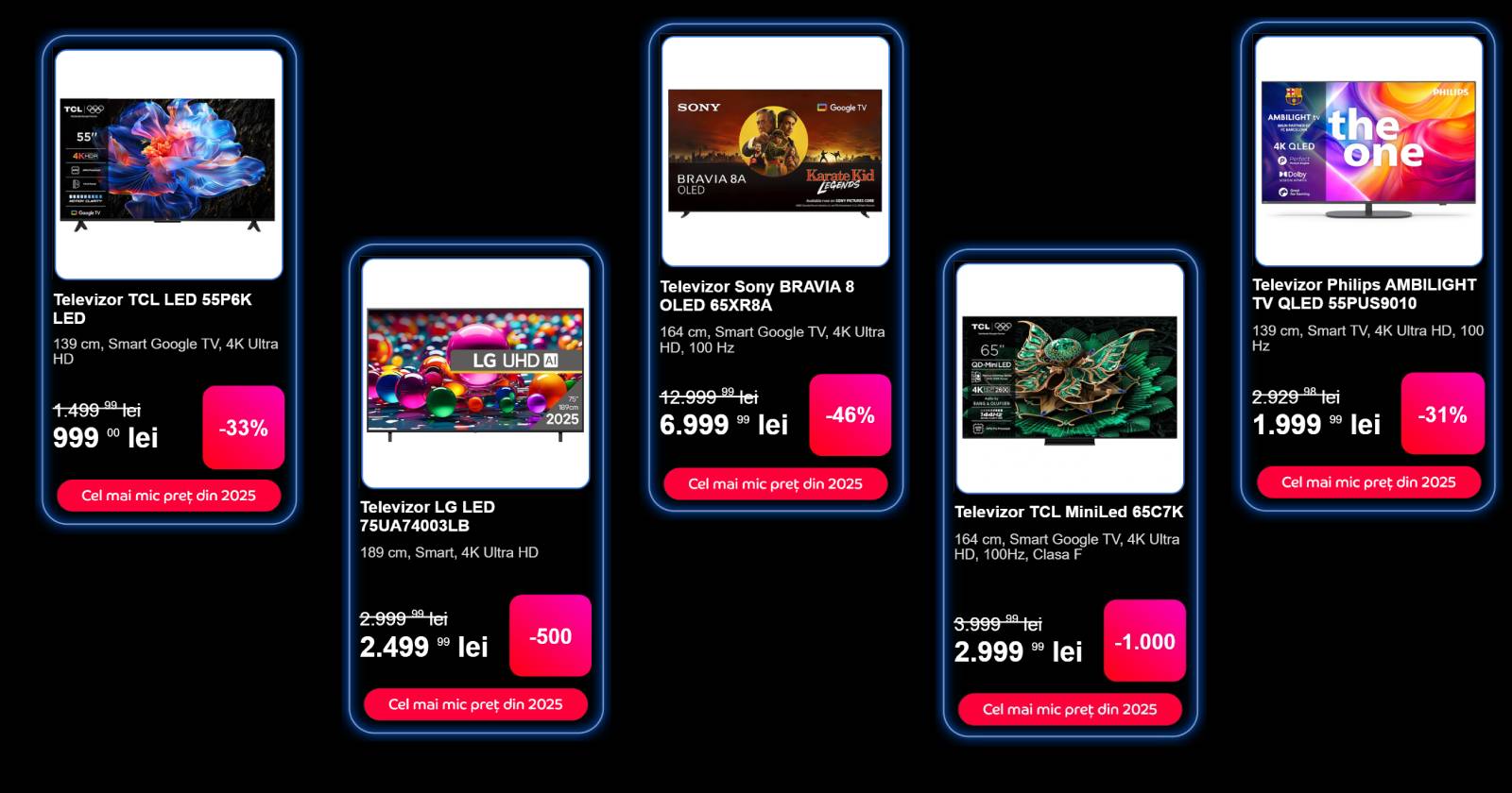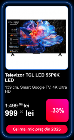 Probabil unul dintre cele mai vânate modele din acest an, destul de accesibil întrucât costă doar 999 lei, fiind redus de la 1499 lei. Ce-i drept, impresionează prin ecranul generos de 139 de centimetri în diagonală și rezoluția 4K Ultra HD. Oferă imagini vibrante, întrucât vorbim despre un LED ce aduce HDR10 și un procesor ce optimizează contrastul, detaliile și naturalețea tonurilor. Are Google TV integrat, iar dacă îl prinzi în coș (întrucât sigur au pus și alții ochii pe el), merită achiziționat la această sumă.