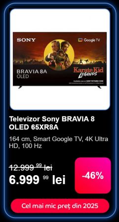 Ajungem la „categoria grea” și avem pe listă un smart TV de generație nouă, Sony BRAVIA 8 OLED 65XR8A, ce primește un discount surprinzător, de 46%. Costă 6.999 lei în variantă cu panou de 164 de centimetri, un OLED ce oferă negru adânc, alb imaculat, culori demențiale și refresh rate crescut. Rulează Google TV perfect optimizat pentru fiecare aplicație de streaming în parte, are un design modern, rafinat și cu siguranță poate mulțumi orice utilizator pretențios.