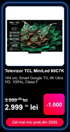 Un alt model, o altă tehnologie, primul MiniLED accesibil de pe această listă. Am 3 prieteni ce au declarat că vor cumpăra acest model dacă are preț bun de Black Friday. Ei bine, iată-l la doar 2.999 lei în variantă cu display de 164 de centimetri în diagonală. E evident că oferă rezoluție 4K, dar vine și cu refresh rate de 100Hz pentru gameri. Dacă ai cumpărat PS5-ul cu discount, acest TV ar fi varianta echilibrată care merge „mână în mână” cu noua ta consolă.