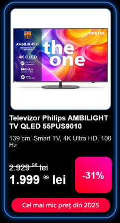 Avem și un smart TV cu Ambilight în ofertă, care cu siguranță face senzație într-o sufragerie modernă. E un model cu panou QLED, 4K Ultra HD, de 139 de centimetri în diagonală ce oferă contrast crescut, refresh rate de 100Hz, culori vii. Costă doar 1.999 lei, fiind redus cu 31% astăzi și merită cumpărat dacă ești fan LED-uri și vrei un TV ce îțî poate anima toată sufrageria.