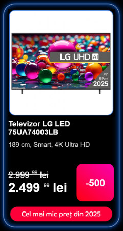 Dacă îți dorești un smart TV gigantic la preț avantajos, LG LED 75UA74003LB e una dintre variantele accesibile din acest an. Cu o diagonală de 189 de centimetri, el costă doar 2.499 de lei, marcând un discount de 500 lei față de prețul inițial. Vine cu un procesor capabil, alpha 7 AI Gen8 și rulează renumitul webOS ce face navigarea prin meniuri foarte lină.