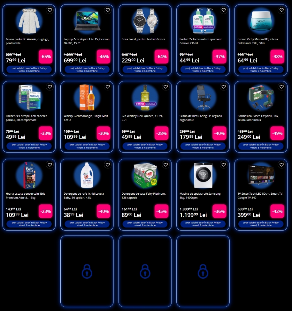Lista de față ne face o idee cu privire la ofertele pe care le vom găsi în ziua de 8 noiembrie atunci când are loc Black Friday 2024 la eMAG, iar dacă te tentează ceva poți pune produsul în favorite sau direct în coșul de cumpărături. Acel laptop la 699 lei nu sună rău și nici televizorul de 80 cm, bun pentru un dormitor.
