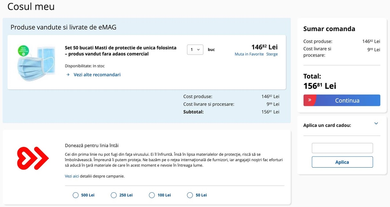 Necesarul pentru medici şi militari, care se luptă în prima linie cu pandemia a fost prioritizat şi distribuit deja, prin programul "Donează pentru linia întâi", în cadrul căruia colaborează Banca Transilvania, Mobexpert, Bitdefender şi eMAG. eMAG recomandă clienţilor şi să urmeze anunţurile autorităţilor, să stea acasă şi să efectueze plata online cu cardul, evitând plata cu cash.