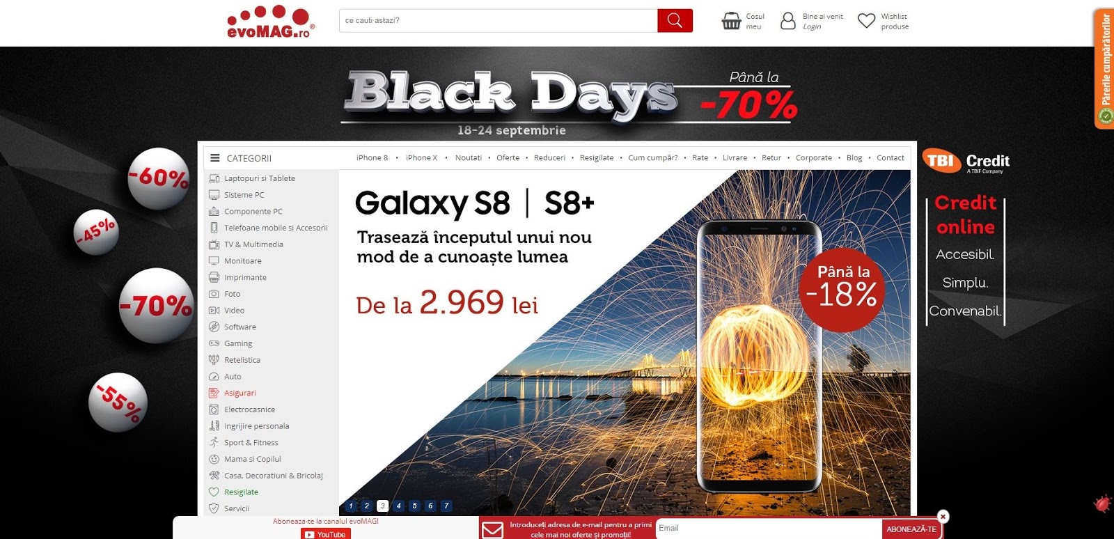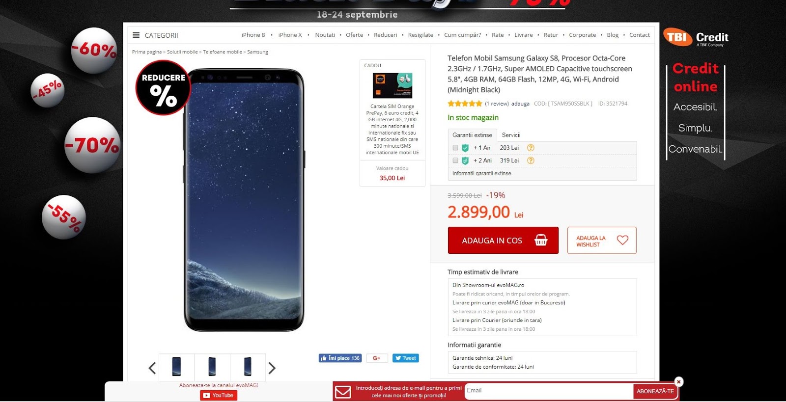 La timp pentru a sublinia precomenzile de iPhone 8, acest UI aduce un slider mare în centrul ecranului şi o numerotare clară a promoţiilor pe care le include. Fără săgeţi ambigue, fără buline prea mici pentru a fi apăsate. De asemenea, după modelul interfaței noi YouTube, acum avem mai puţine margini şi chenare. Categoriile din stânga indică cel mai bine acest lucru, dar şi pagina fiecărui produs.