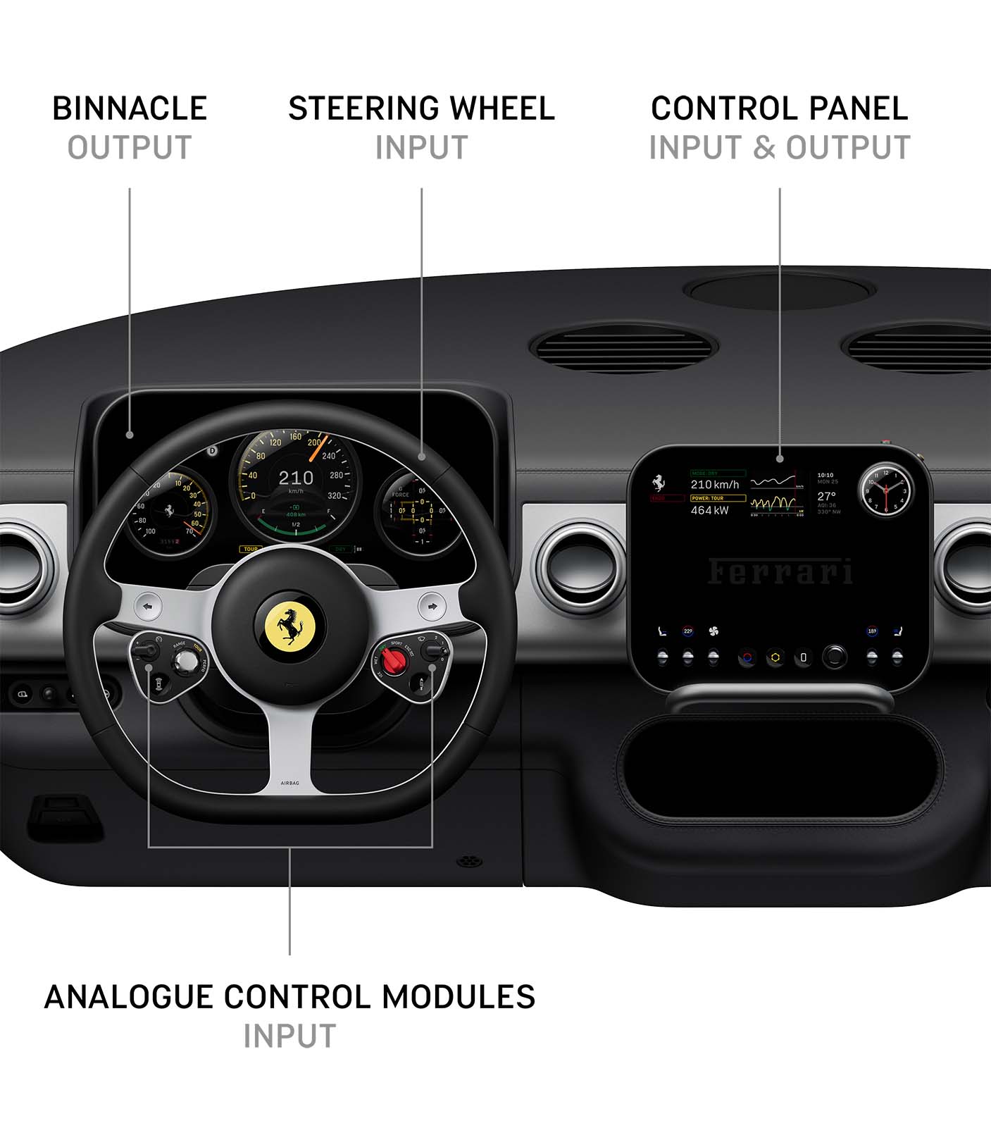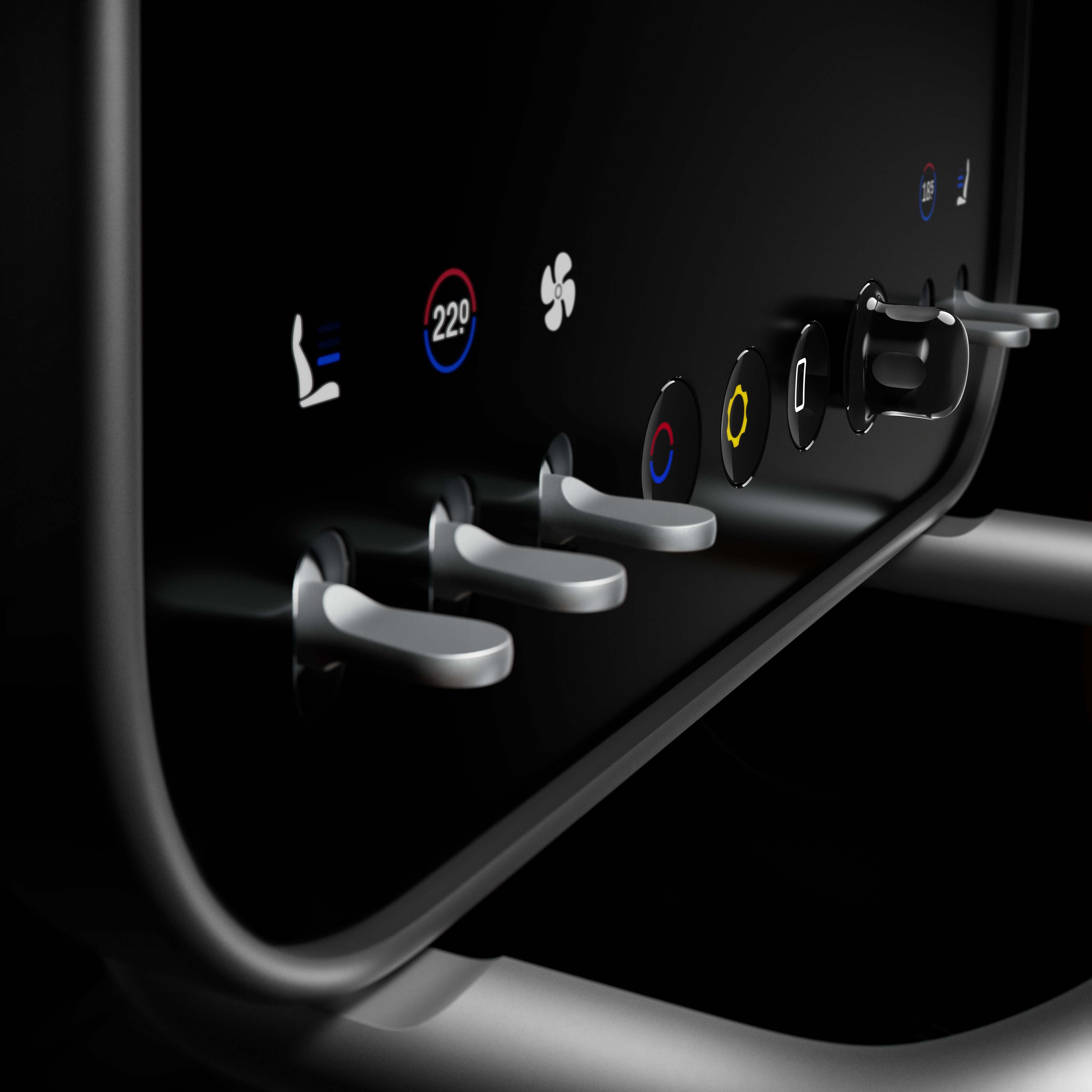 Instrumentarul de bord este numit Binnacle folosit pentru output, avem volanul cu butoane pentru input și panoul de infotainment, un Control Panel pătrat. Jony spune că a creat o interfață organizată, cu afișaje și controale grupate în mod funcțional, cu toate la îndemână.