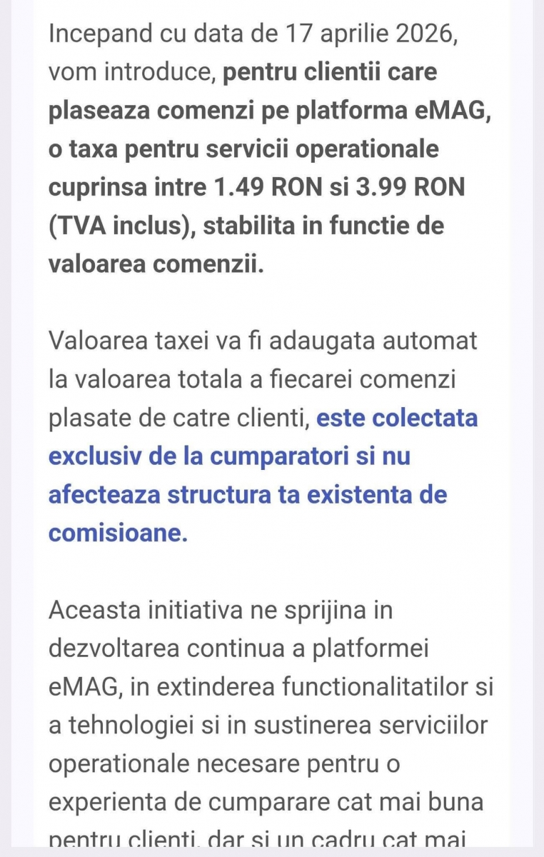 „Începând cu 17 aprilie 2026, eMAG introduce un cost de servicii operationale de 1% din valoarea produselor comandate, de minim 1,49 lei (TVA inclus), dar nu mai mult de 3,99 lei (TVA inclus), și se aplică tuturor comenzilor plasate pe platformă.