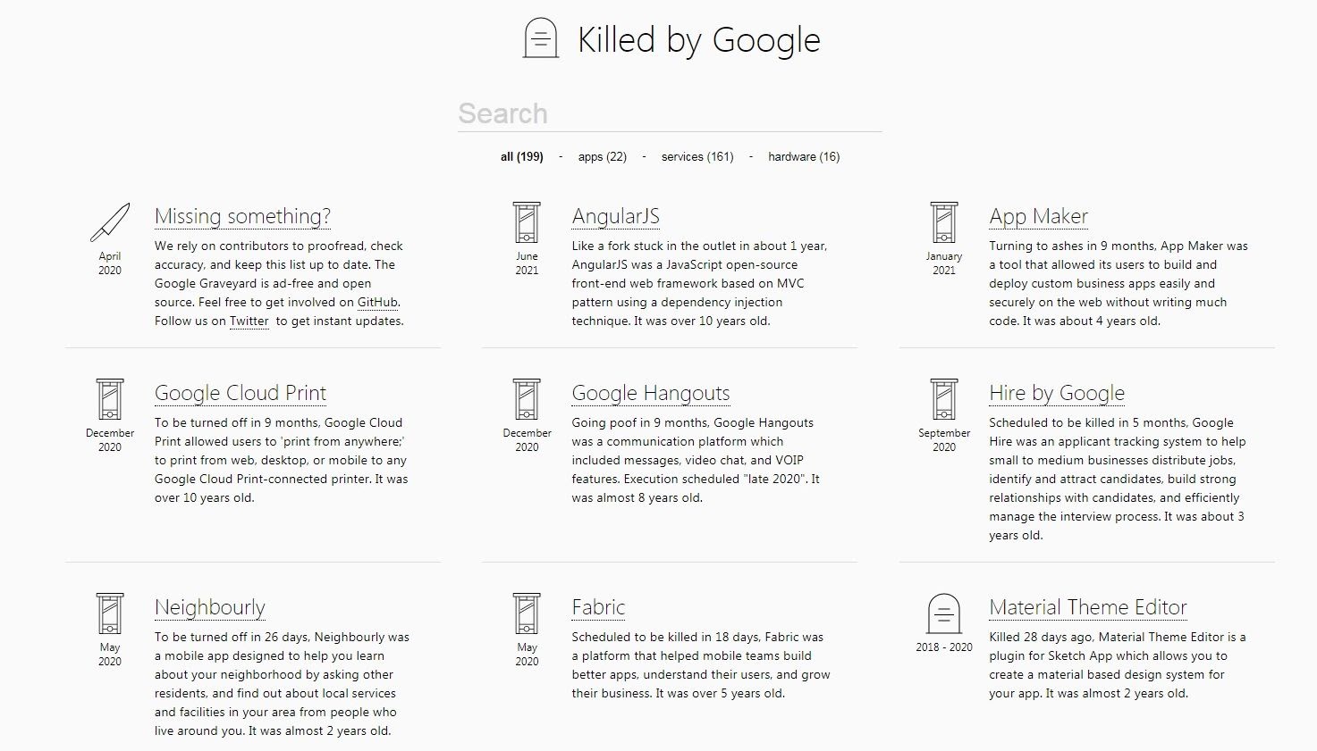 Nu ştiu dacă ştiţi, dar Google are o adevărată "cultură a eşecului", iar eşecul e văzut drept ceva pozitiv în Silicon Valley, ceva din care înveţi şi devii mai bun. Cred că nici o altă companie tech nu mai are o listă cu proiecte ucise atât de mare, unele chiar apreciate de fani. Nici până în ziua de azi nu înţelegem de ce a încetat să existe Google Reader, dar în fine, trece peste. Pe site-ul Killed By Google găsiţi aproximativ 200 de proiecte, care datează din 2006 până azi.