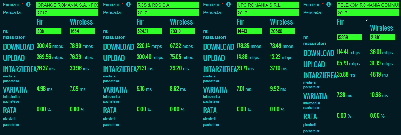 Din câte puteți remarca privind statisticile de mai sus, Orange România a fost în vârful acestui clasament cu o viteză medie de download la internet fix de 300.45 Mbps și o viteză de upload medie de 78.90 Mbps. Pe locul secund se află RCS & RDS, furnizor care a distribuit servicii de internet fix cu viteze medii de acces de 220.14 Mbps la download, respectiv 67.22 Mbps la upload.