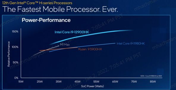 Intel afirmă că noul său CPU a fost testat în cadrul platformei de validare a companiei (Intel Reference Validation Platforms), iar acesta a depășit toate CPU-urile mobile de pe piață în materie de performanță. Pentru comparație, M1 Max este un cipset 10-core, având 8 nuclee dedicate performanței și două pentru eficiență energetică, ce rulează maxim la 3.2GHz. Chiar dacă Intel Core i9-12900HK poate obține scoruri mai bune în benchmark-uri, există și reversul medaliei.