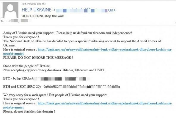 Încă din 25 februarie, laboratoarele antispam ale Bitdefender au raportat primele semne ale escrocilor care exploatează invazia Ucrainei de către Rusia. Așa cum era de așteptat, hackerii continuă să profite de criza umanitară în plină desfășurare pentru propriile câștiguri financiare. Multe atacturi par să vizeze criptomonede precum Bitcoin și Ethereum, mai ales după ce guvernul ucrainean a anunțat că acceptă donații prin intermediul monedelor virtuale.