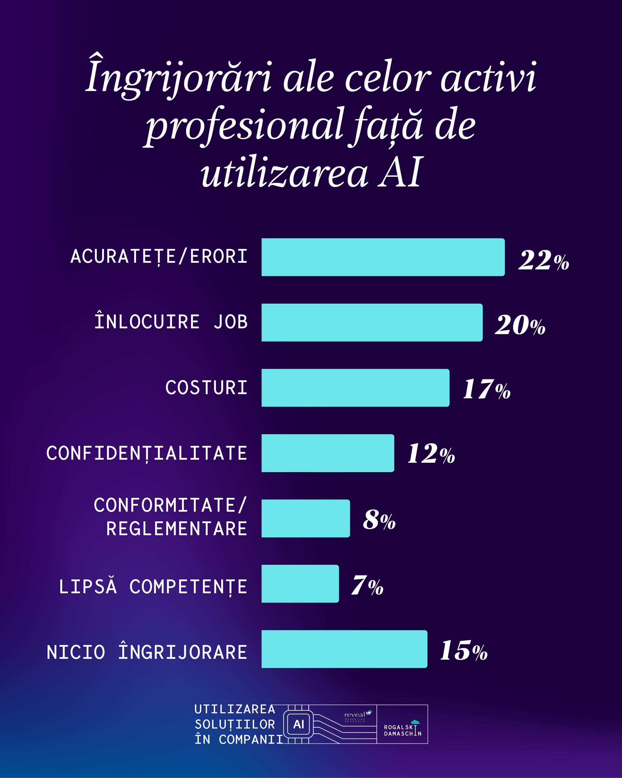 Totul pleacă din conducere și descoperim că atitudinea leadership-ului este motivul, fiind multă precauție la mijloc (34%), sau de rezistență (14%). Pe de altă parte, 13% dintre liderii români sunt entuziasmați de posibilitatea integrării AI în business-ul pe care îl desfășoară.