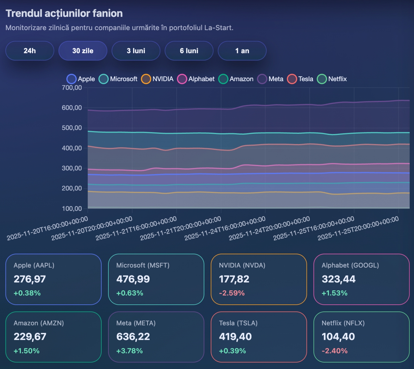 În paralel, Microsoft (+0,63%) continuă un parcurs lent, dar constant, în urma raportărilor financiare, iar Apple urcă marginal cu +0,38%, deși rămâne presată de probleme legale în Franța și conflicte privind serviciile muzicale. Tesla e aproape pe loc, cu +0,39%, fără informații noi care să impulsioneze acțiunile.
