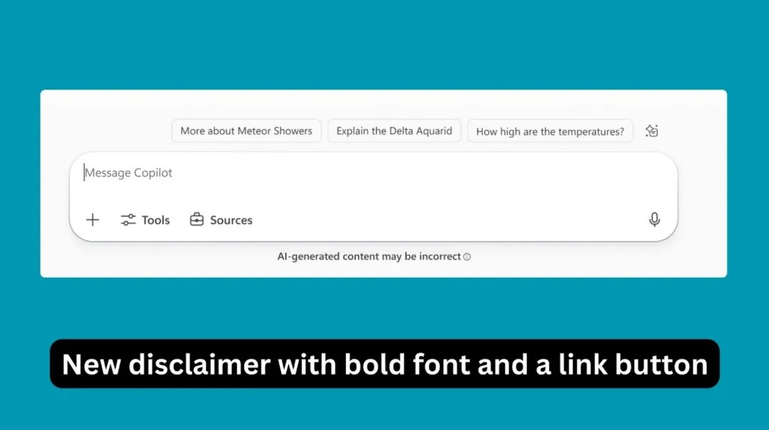 Microsoft a făcut o schimbare la uneltele Copilot recent, dar fără să facă mare tam-tam. Până acum era afişat un mesaj disclaimer care avertiza cu privire la faptul că "Conţinuturile generate cu AI pot fi imprecise". Sau informaţii false... Acum a renunţat la asta.