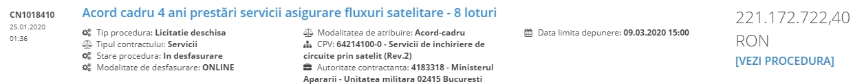 Potrivit anunțului publicat pe platfoma SICAP, această licitație urmărește asigurarea fluxurilor satelitare și a serviciilor de comunicații prin satelit necesare structurilor Armatei Române discolate în teatrele de operații. Sunt necesare asemenea circuite prin satelit pentru a asigura nevoia de comunicare în locații greu accesibile, sau în situații de urgență, dezastre sau instruire.