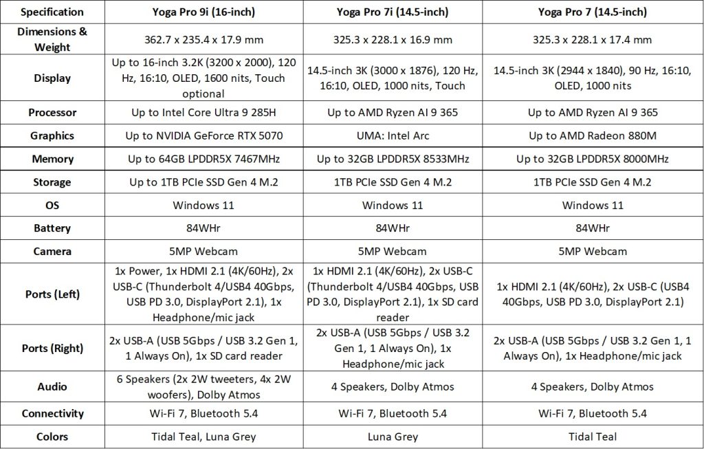 Pe partea de conectivitate, toate modelele Yoga Pro dispun de Wi-Fi 7 și Bluetooth 5.4, alături de o selecție generoasă de porturi, inclusiv USB-C cu suport Thunderbolt 4 (pe modelele Intel) sau USB4 (pe modelele AMD). Lenovo a adăugat și o nouă schemă de culori, cu variantele Tidal Teal și Luna Grey, oferind un design elegant și modern.