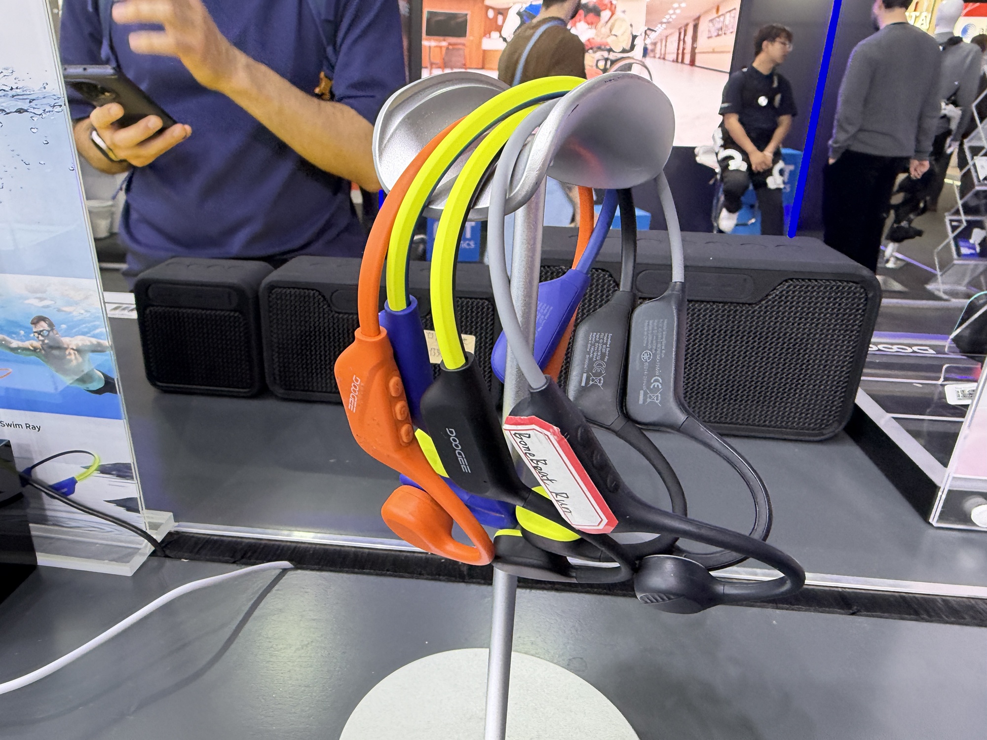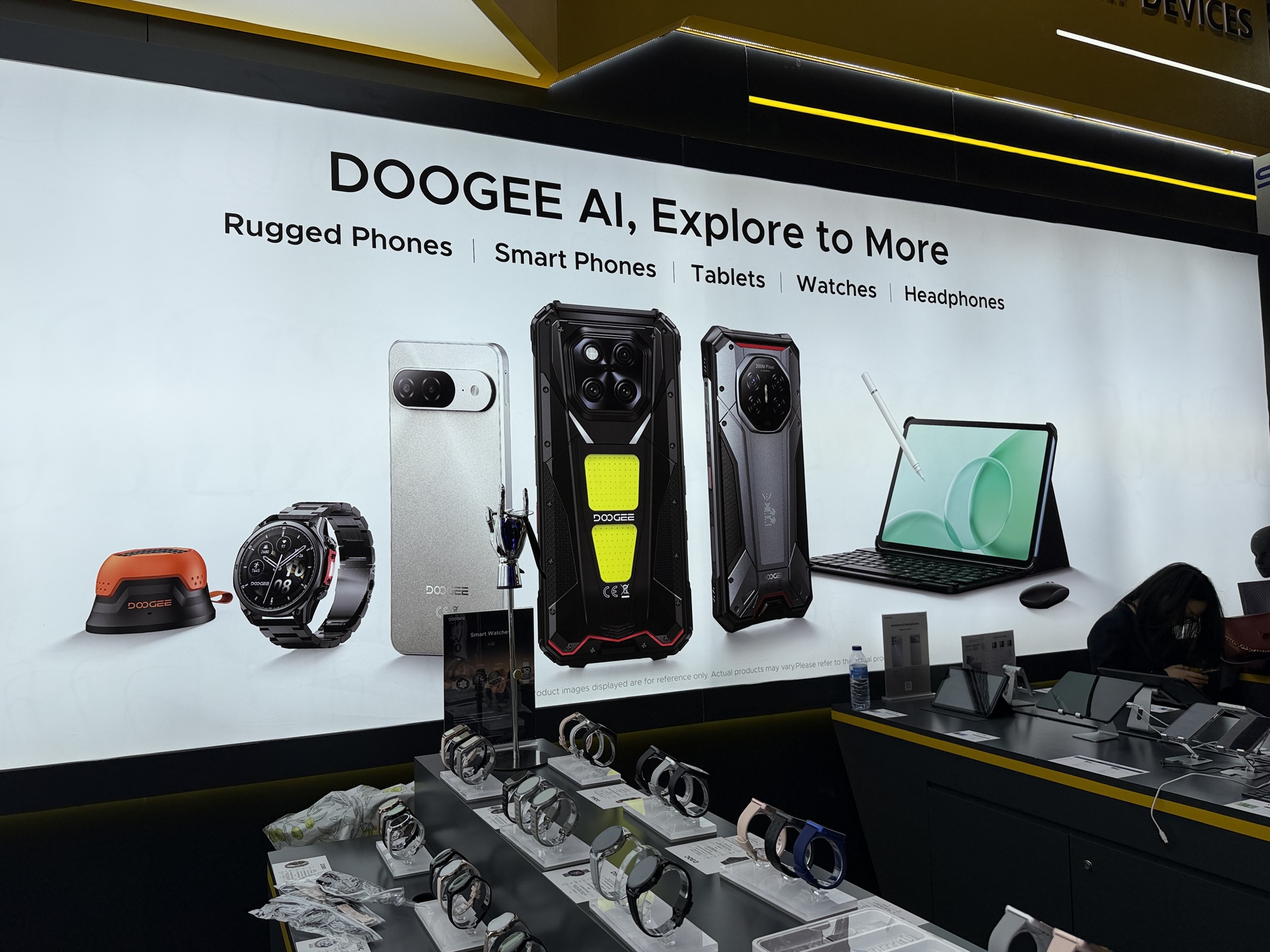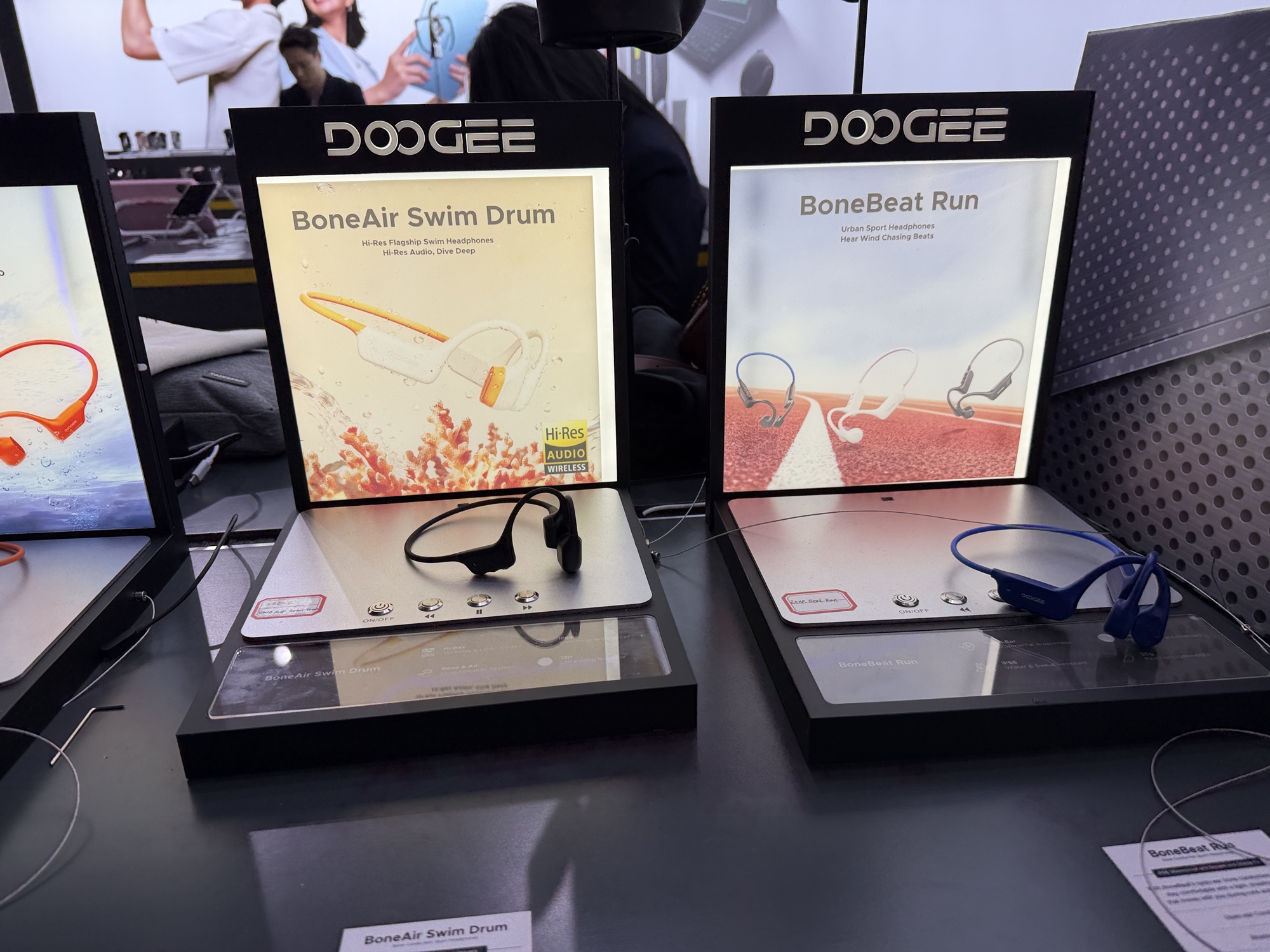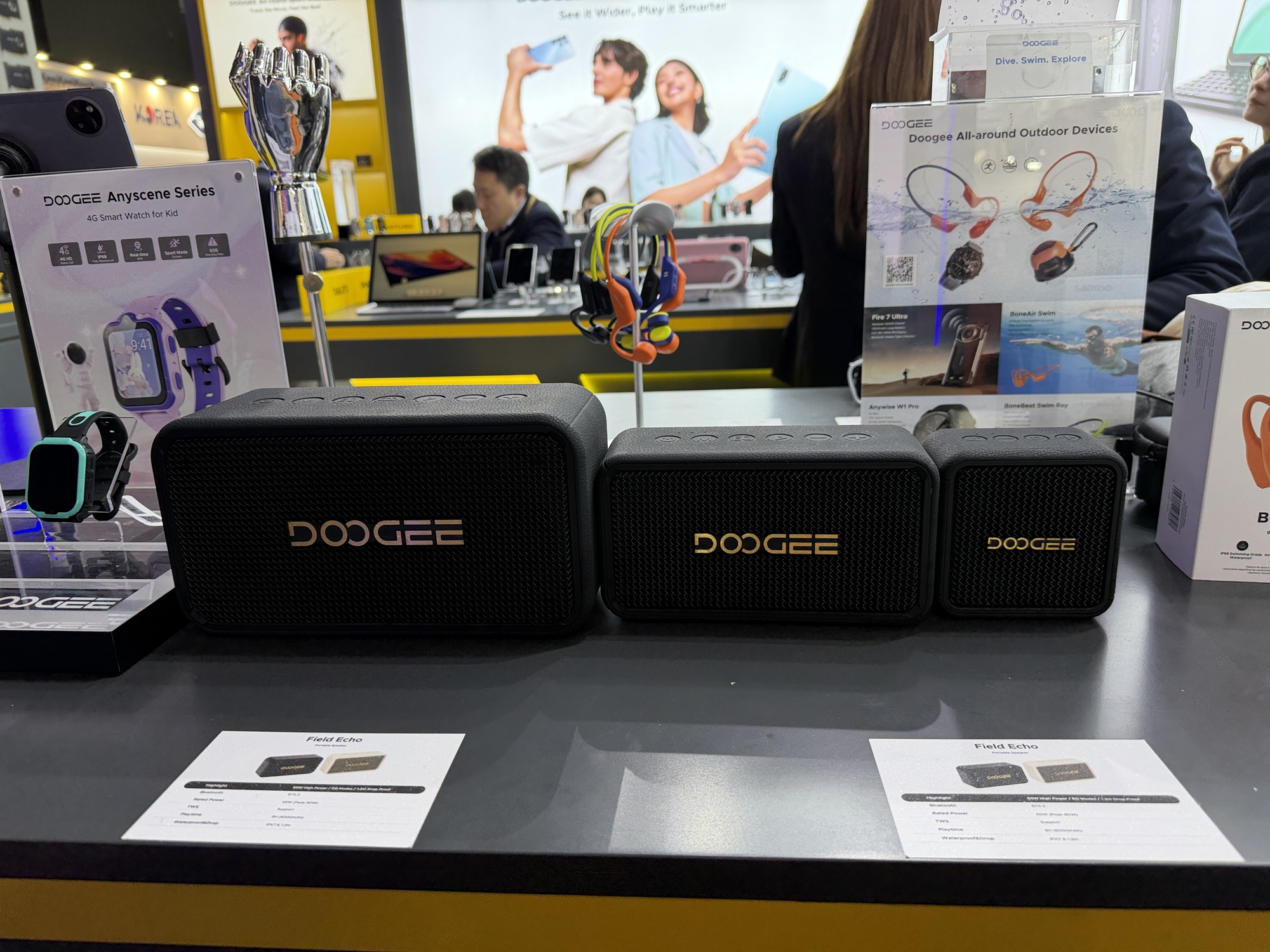 Încă de la intrarea în stand se vede o pereche de căști care funcționează sub apă, prin conducerea sunetului prin os. De departe cel mai șocant aspect la stand este cantitatea uriașă de ceasuri găsite acolo. Atât elegante, cu curea metalică, cât și unele pentru copii sau pentru sport. Modelul de telefon Doogee Fire 6 are în sfârșit un senzor termic HD, fără acei senzori de rezoluție mică de până acum.