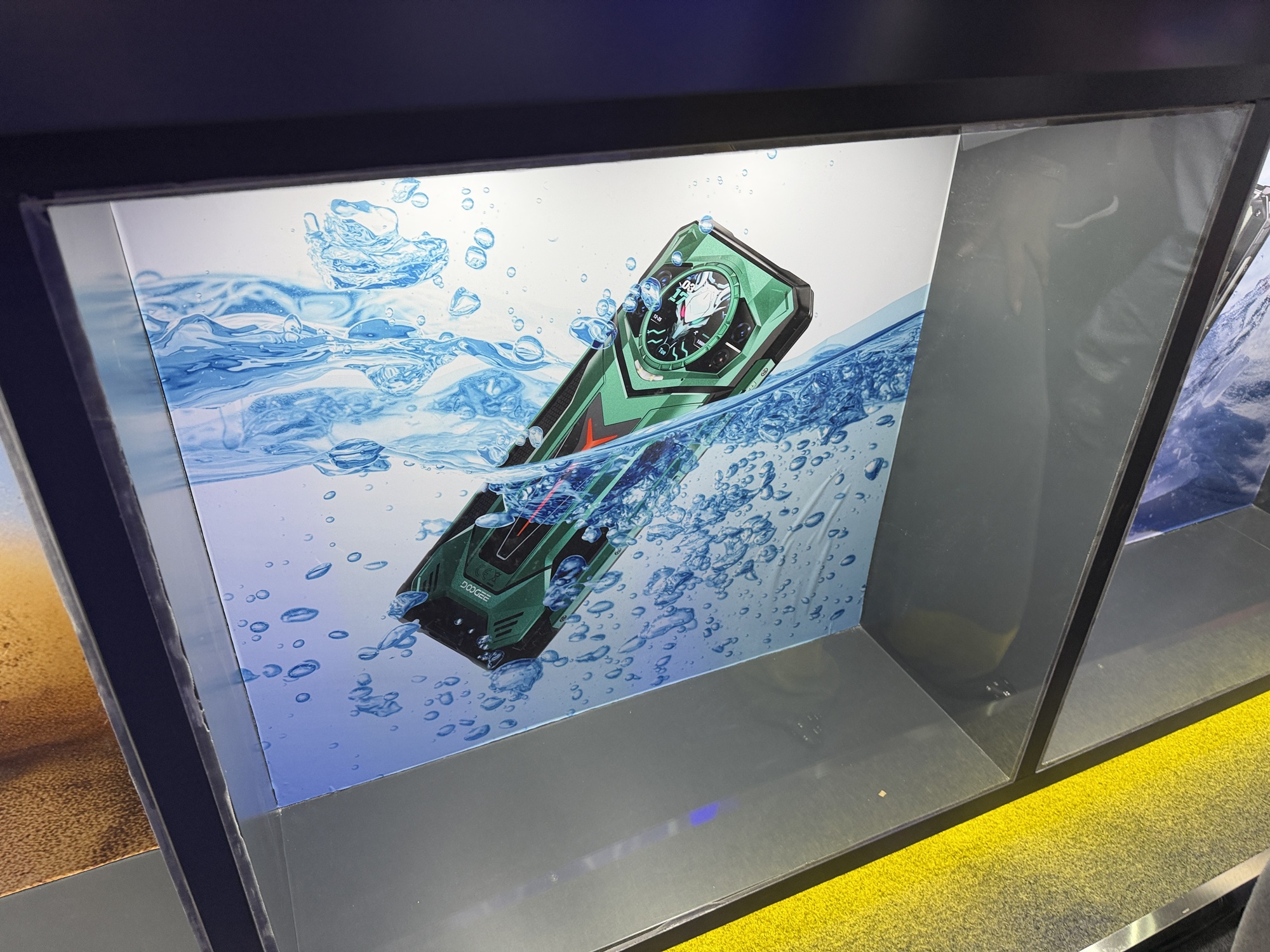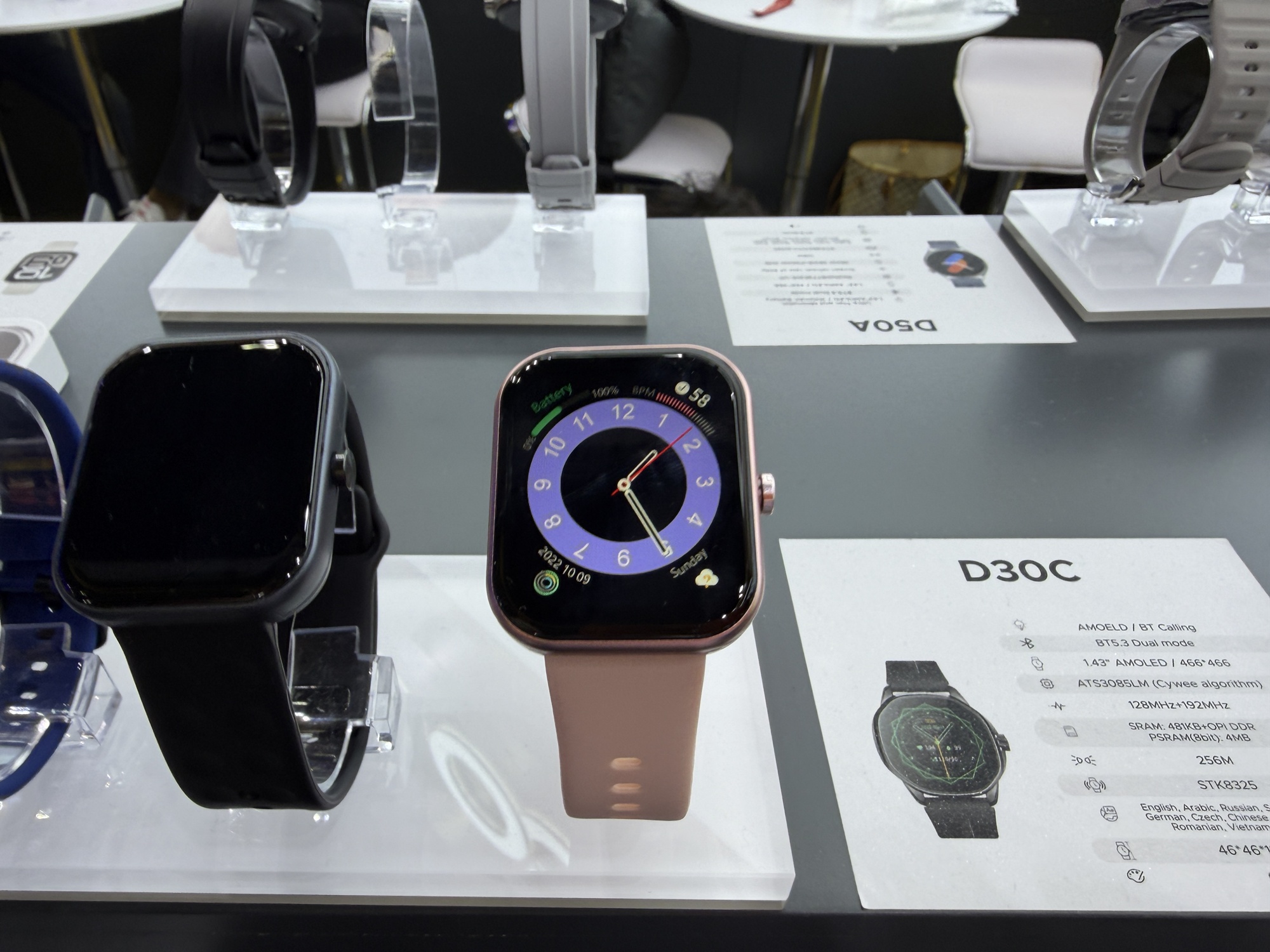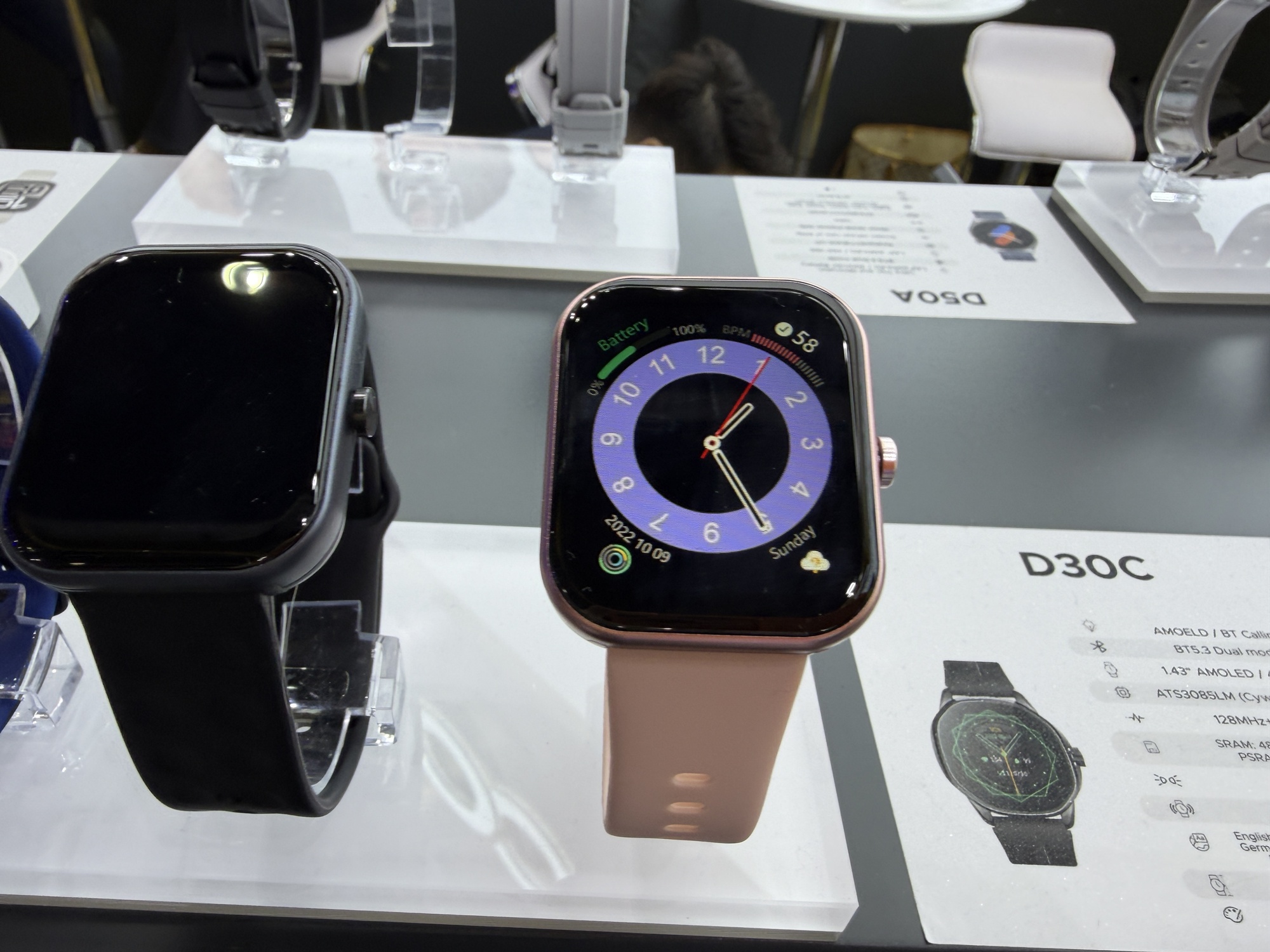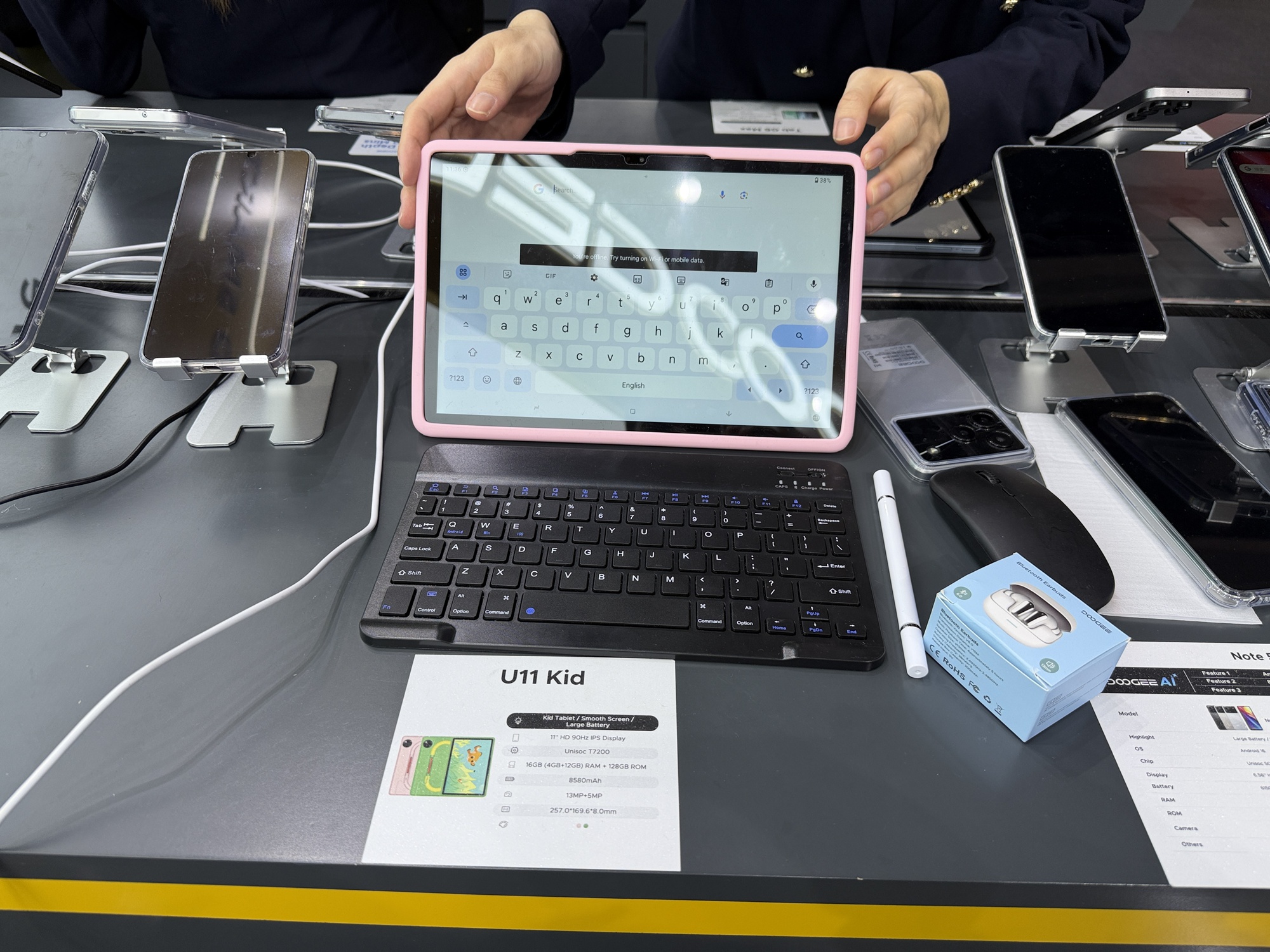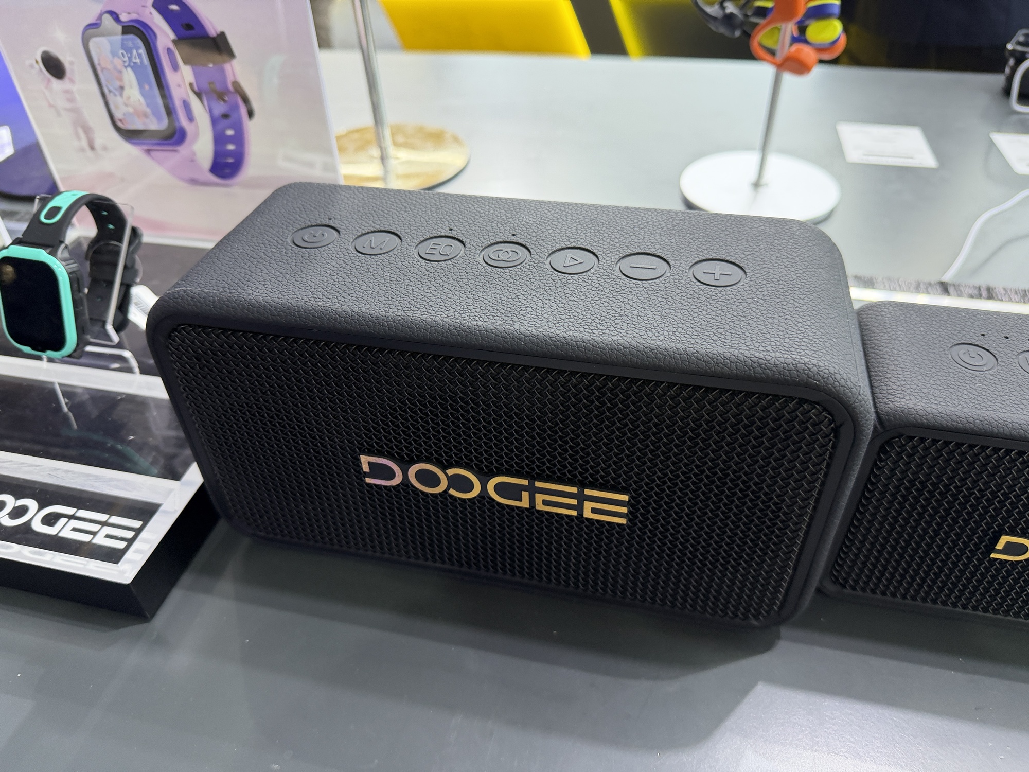 Încă de la intrarea în stand se vede o pereche de căști care funcționează sub apă, prin conducerea sunetului prin os. De departe cel mai șocant aspect la stand este cantitatea uriașă de ceasuri găsite acolo. Atât elegante, cu curea metalică, cât și unele pentru copii sau pentru sport. Modelul de telefon Doogee Fire 6 are în sfârșit un senzor termic HD, fără acei senzori de rezoluție mică de până acum.