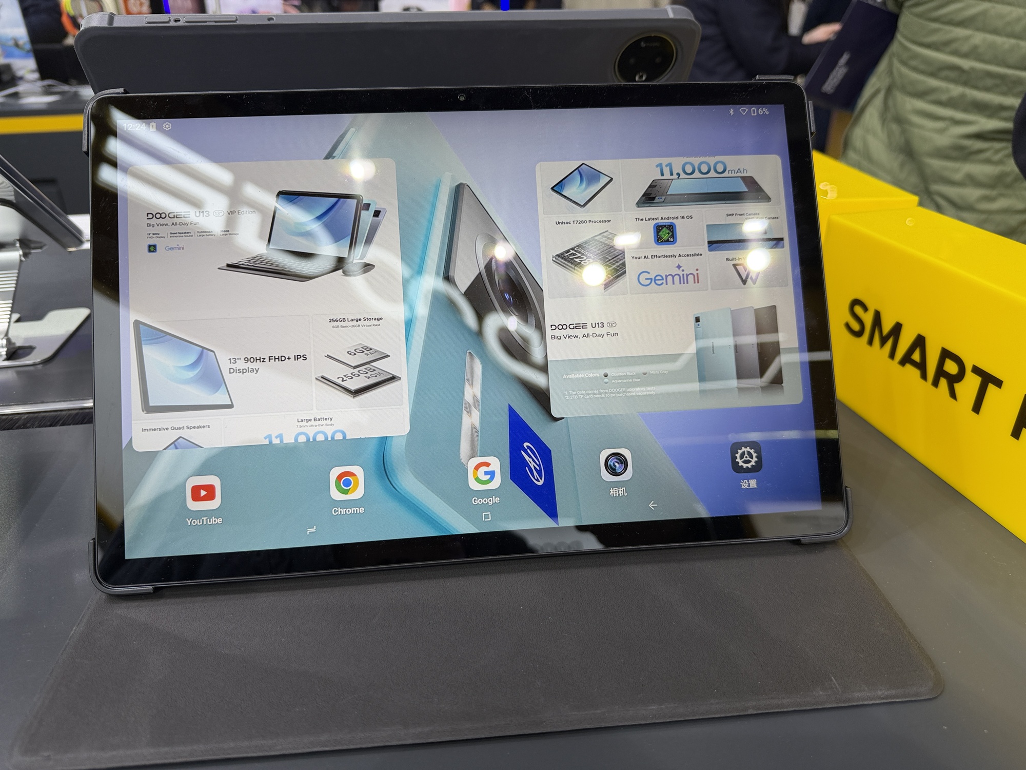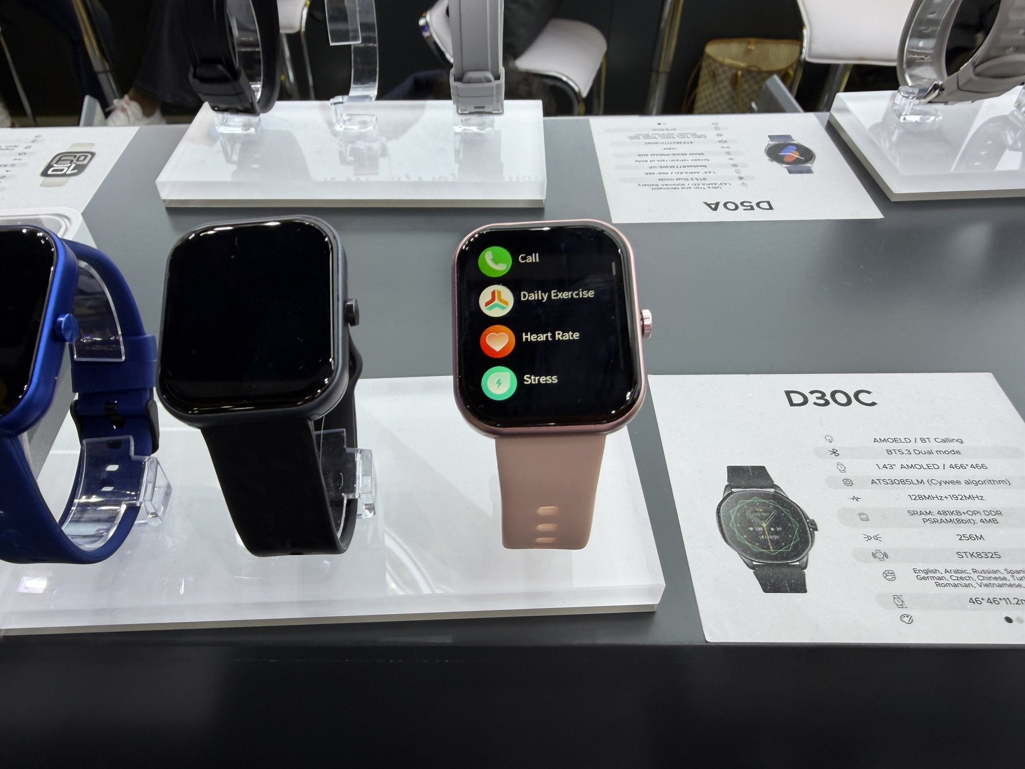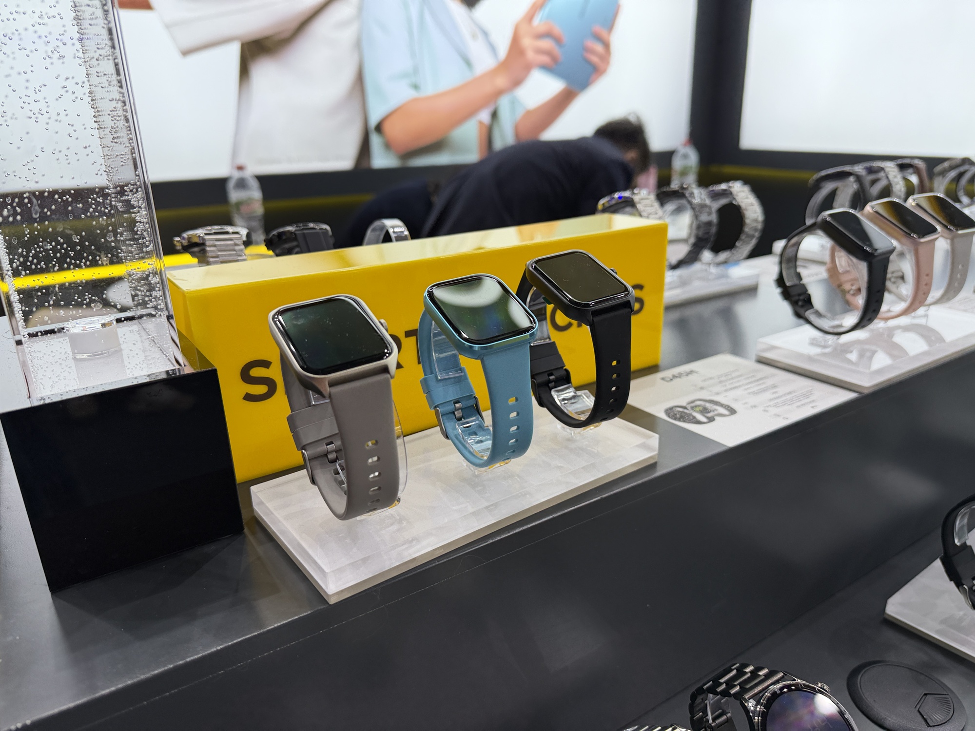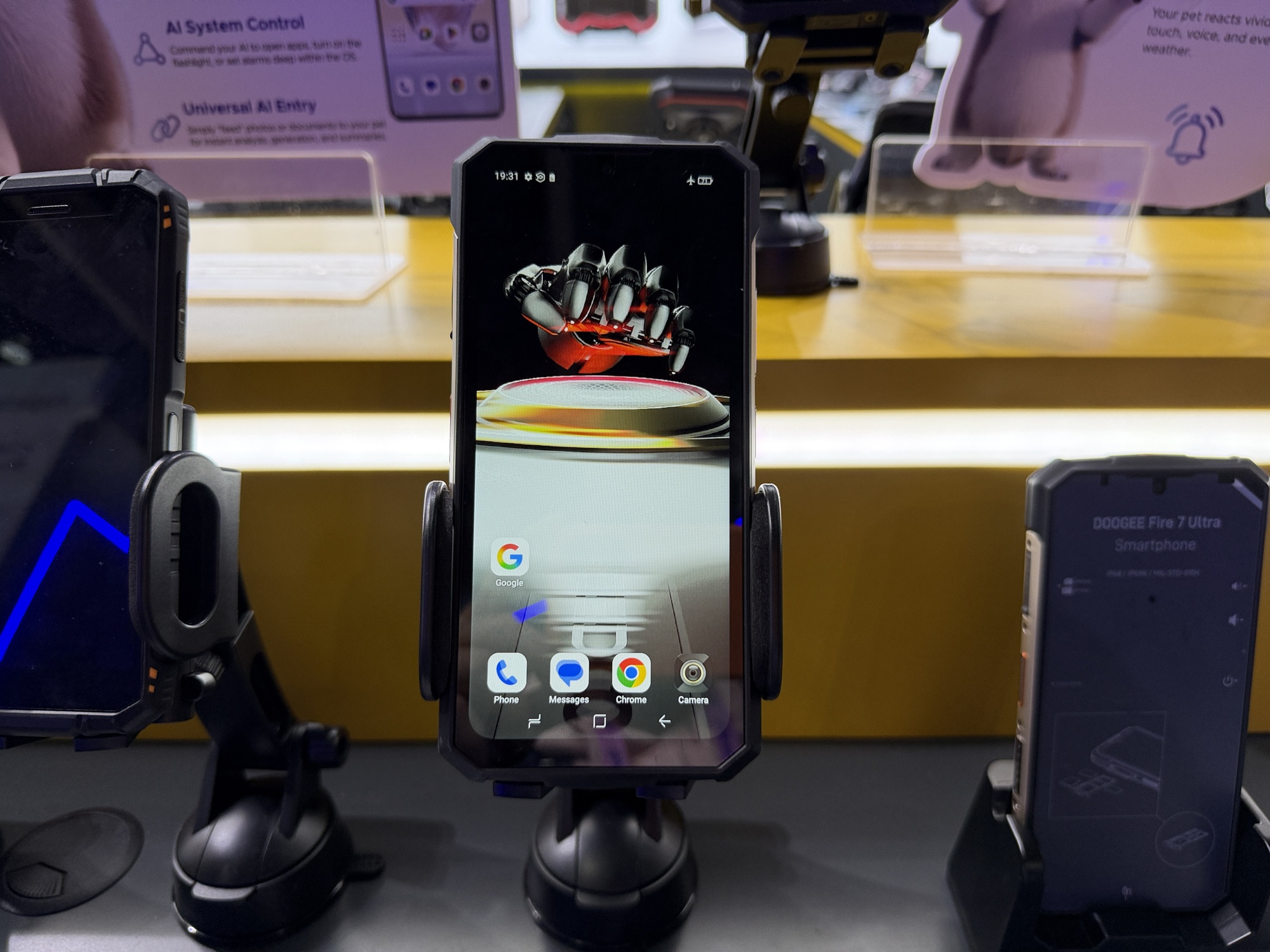Încă de la intrarea în stand se vede o pereche de căști care funcționează sub apă, prin conducerea sunetului prin os. De departe cel mai șocant aspect la stand este cantitatea uriașă de ceasuri găsite acolo. Atât elegante, cu curea metalică, cât și unele pentru copii sau pentru sport. Modelul de telefon Doogee Fire 6 are în sfârșit un senzor termic HD, fără acei senzori de rezoluție mică de până acum.