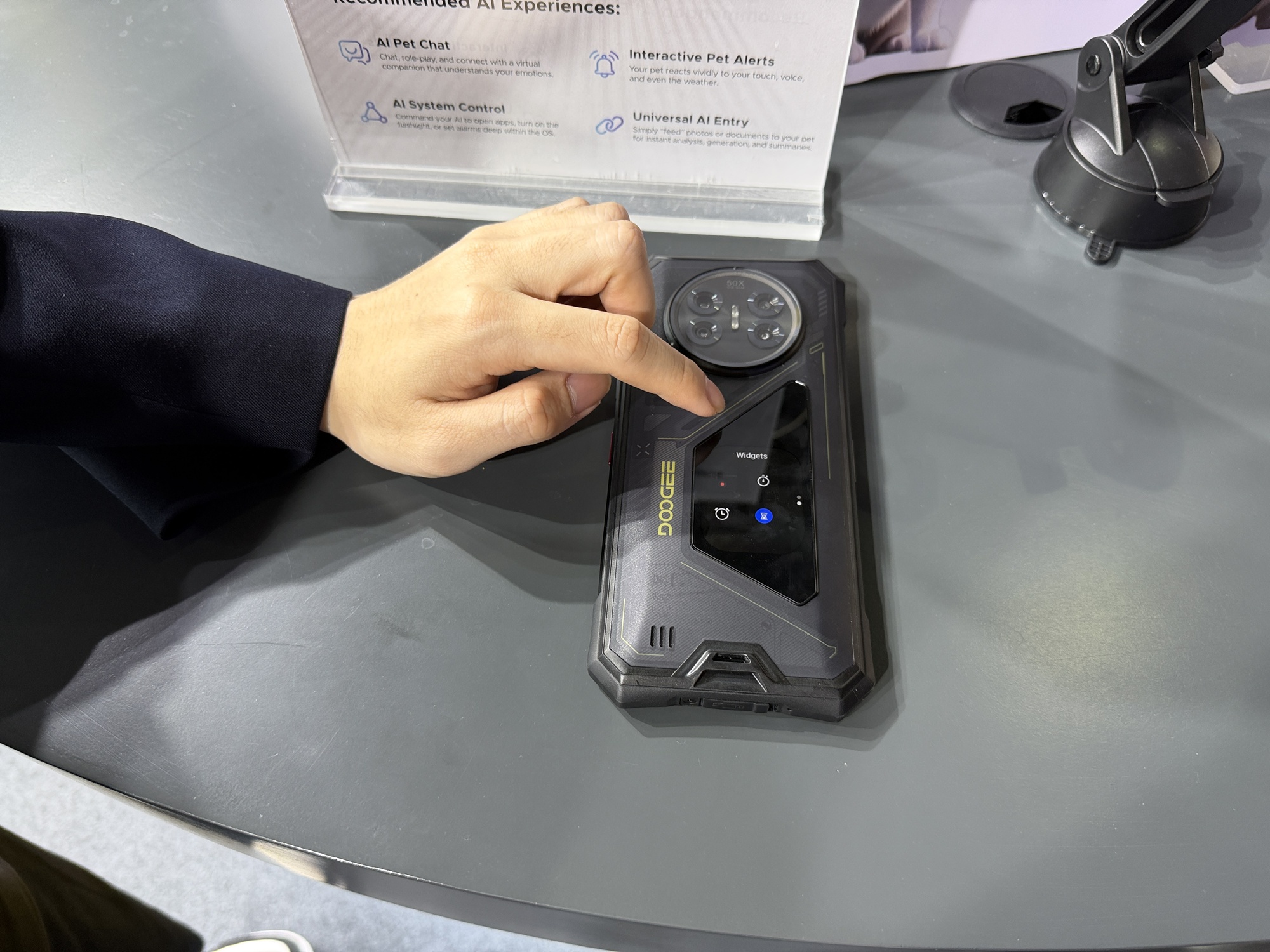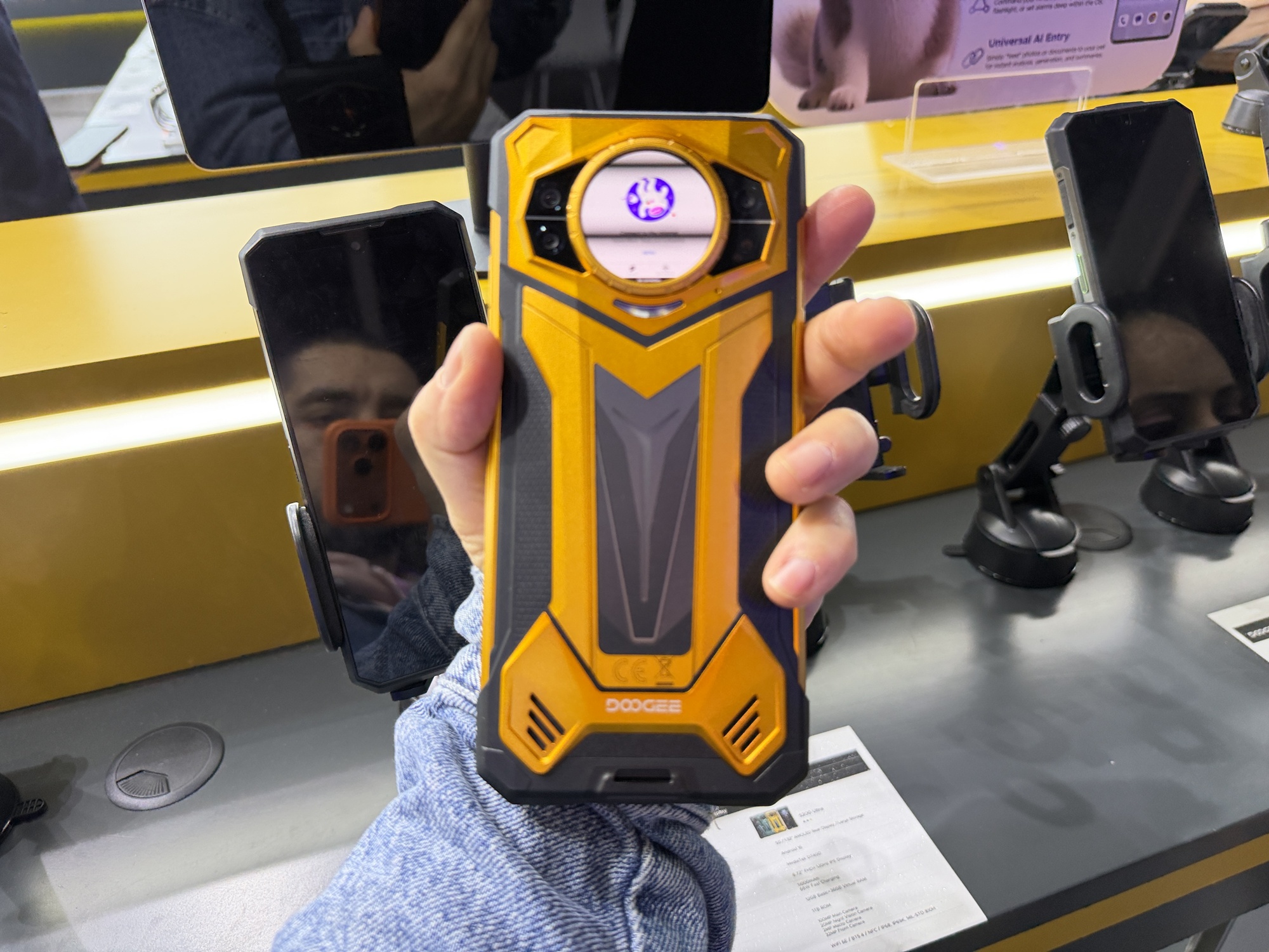 Totuși telefonul flagship de la DOOGEE este unul cu baterie de 20.000 mAh. Are ecran secundar pe spate și cântărește 600 de grame. Aduce și lampă de camping și lumini de SOS, în caz că te pierzi în munți. Am văzut și că telefoanele robuste au primit un AI simpatic, un animal de companie pentru cei singuratici, afișat pe ecranul secundar de pe spate.