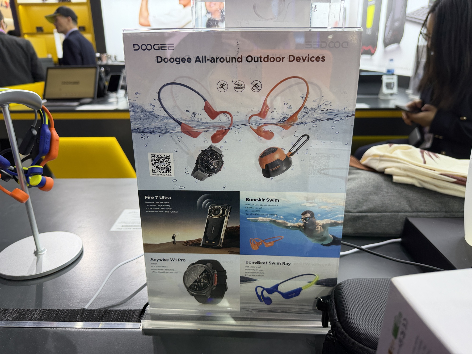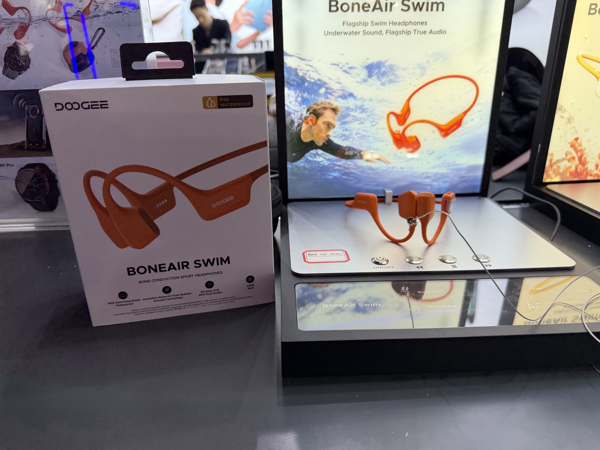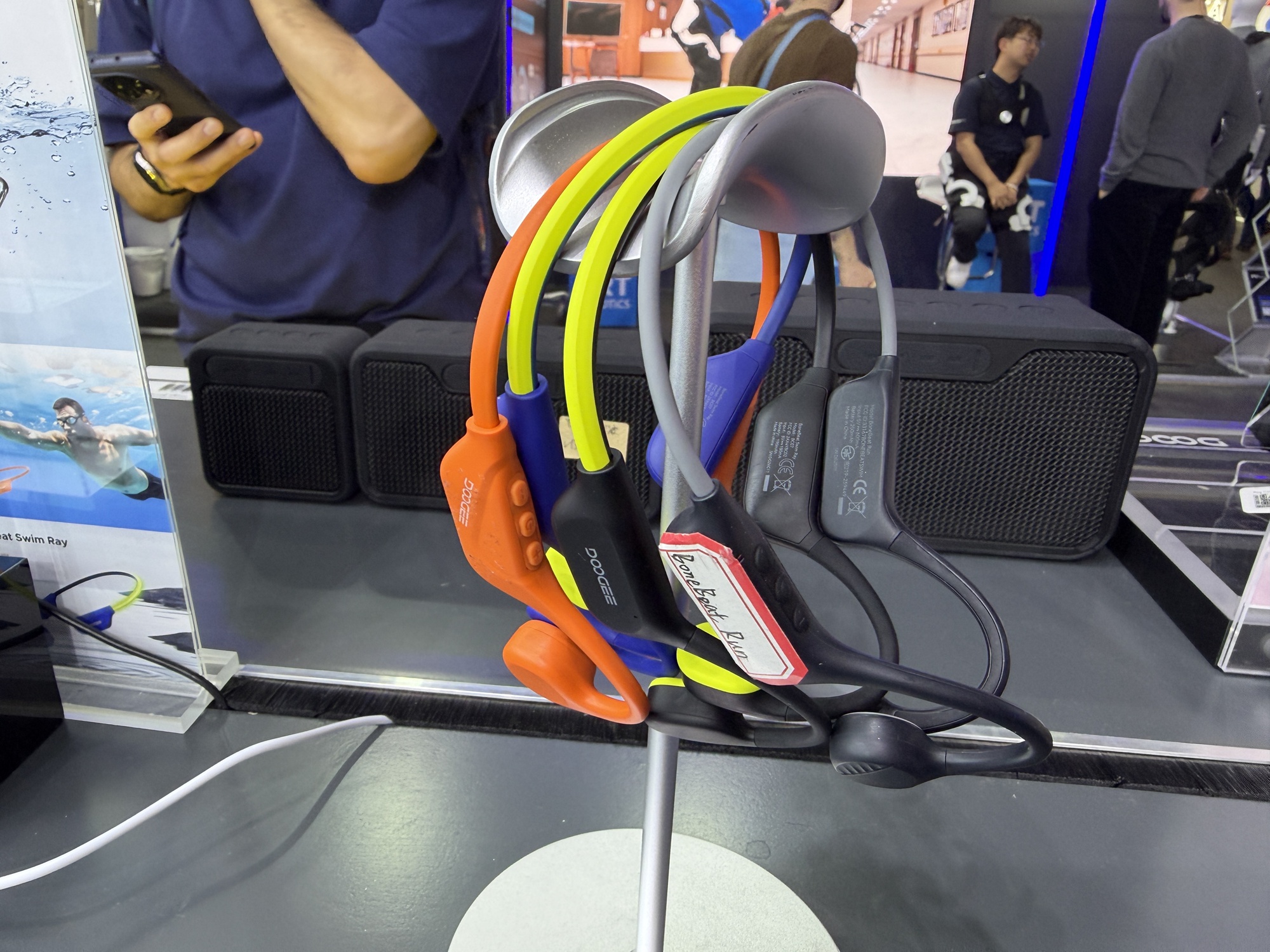 Chiar dacă standul celor de la DOOGEE este mai degrabă despre telefoane robuste, cu baterii de mulți mAh, am dat și peste căști care se pot folosi sub apă. DOOGEE Bone Air Swim îți permit să asculți muzica în vreme ce înoți, adică sub apă.