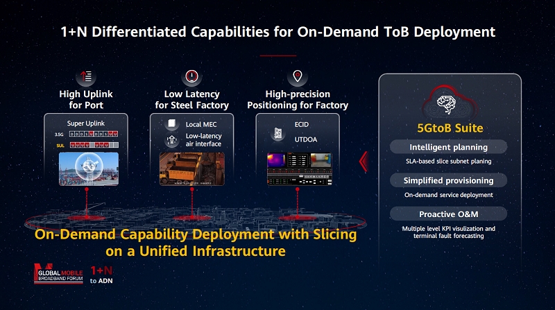 - 5GtoB Network reprezintă infrastructura soluției 5G. Astfel, aflăm că Huawei îşi va dezvolta capacitatea de a oferi servicii 5GtoB pe bază de scenariu, inclusiv planificare, construcţie, întreţinere şi optimizare de reţea;