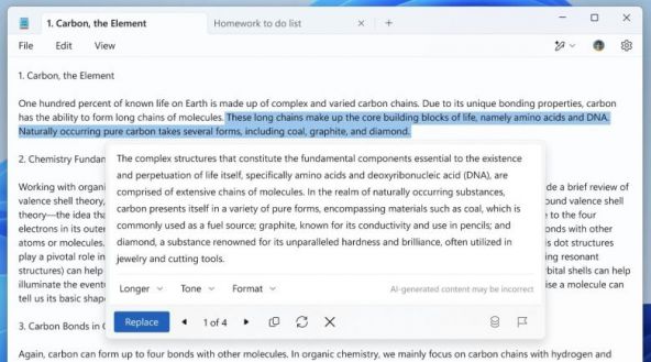 În Notepad, Microsoft introduce instrumentul Rewrite, care permite rescrierea textului pentru a ajusta tonul sau lungimea. De exemplu, textul prea formal poate fi rescris într-un mod „relaxat” sau scurtat. Funcția oferă trei variante pentru fiecare selecție și permite utilizatorilor să refacă procesul dacă rezultatele nu sunt pe placul lor.