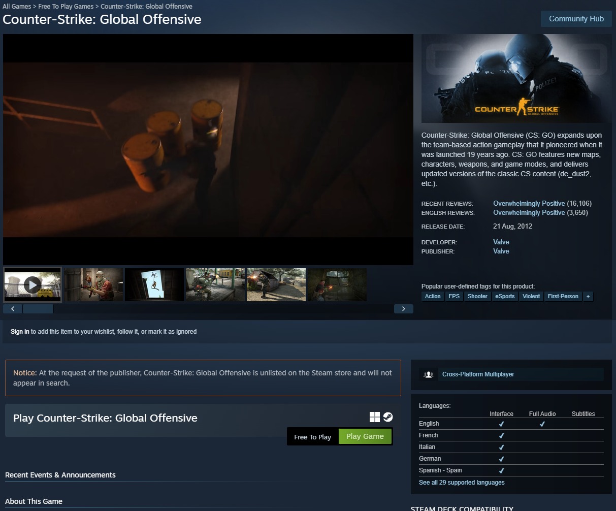 Ei bine, vești bune! Counter Strike Global Offensive a apărut de nicăieri pe Steam Store și poate fi descărcat și jucat de oricine. Din păcate, jocul nu apare ca fiind listat pe Steam, astfel că puteți accesa pagina dedicată doar printr-o căutare pe Google sub forma „CSGO Steam Store” sau accesând link-ul de mai jos. Vestea a fost primită cu foarte mult entuziasm de întreaga comunitate a Steam. Au apărut mențiuni despre această reîntoarcere glorioasă peste tot - pe Facebook, pe Reddit, pe Instagram etc.