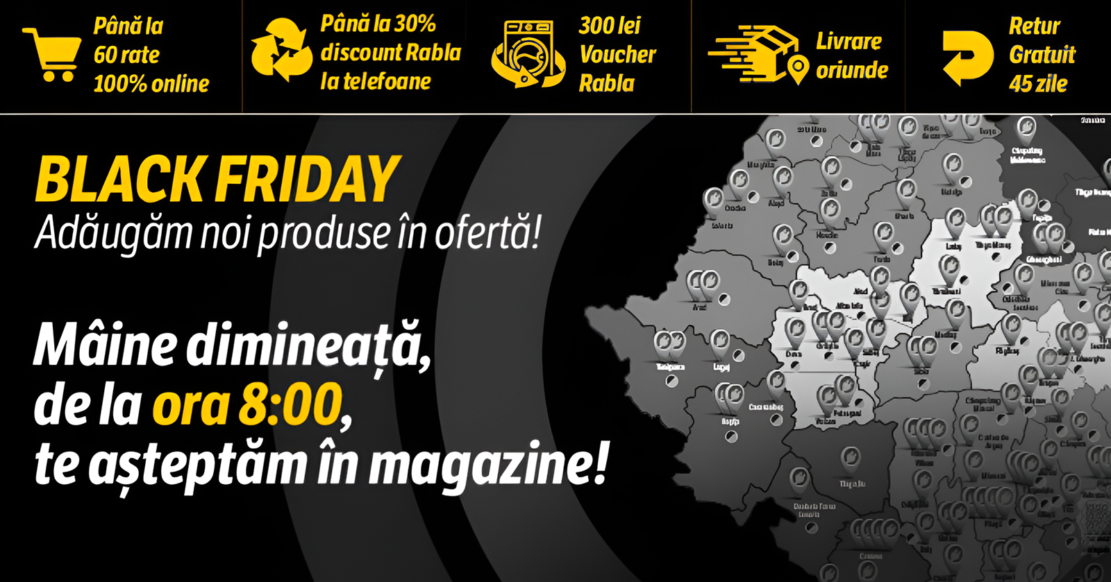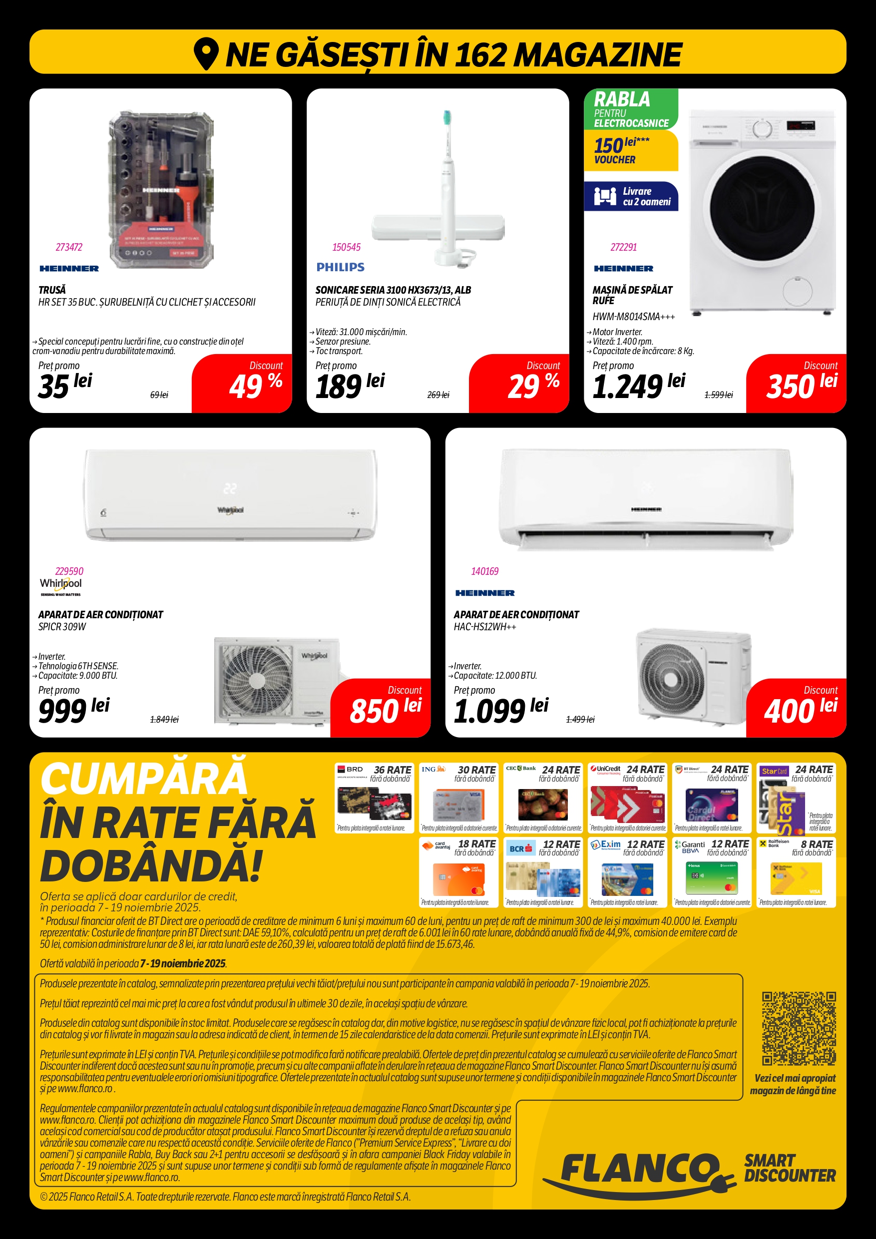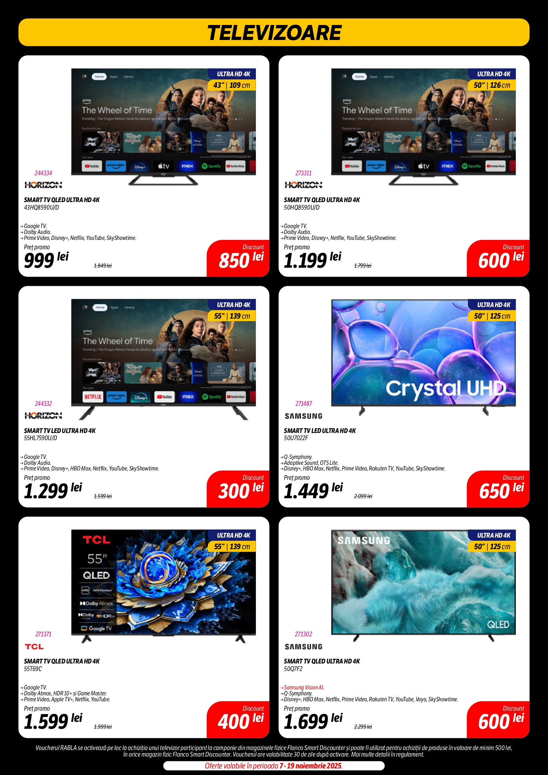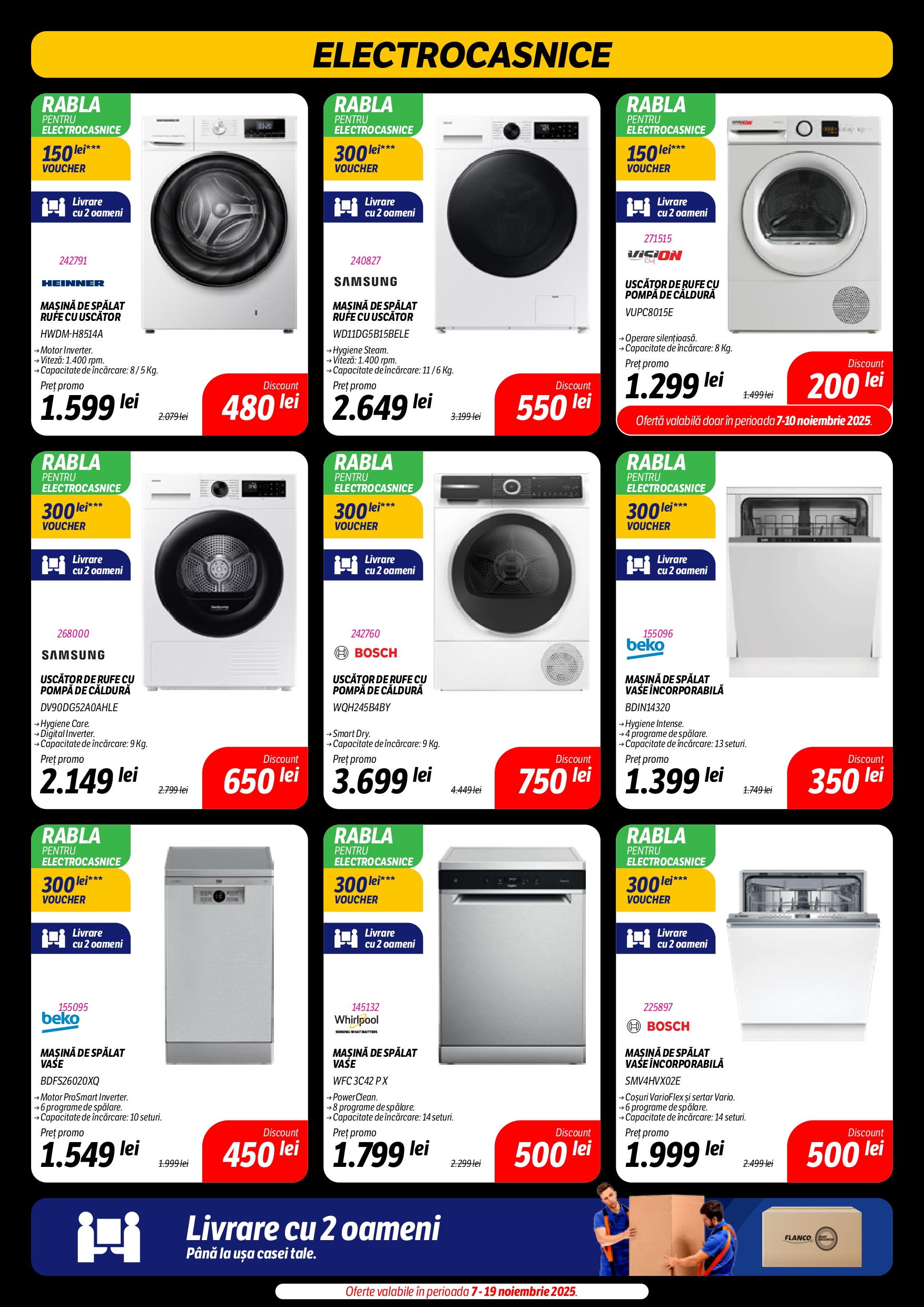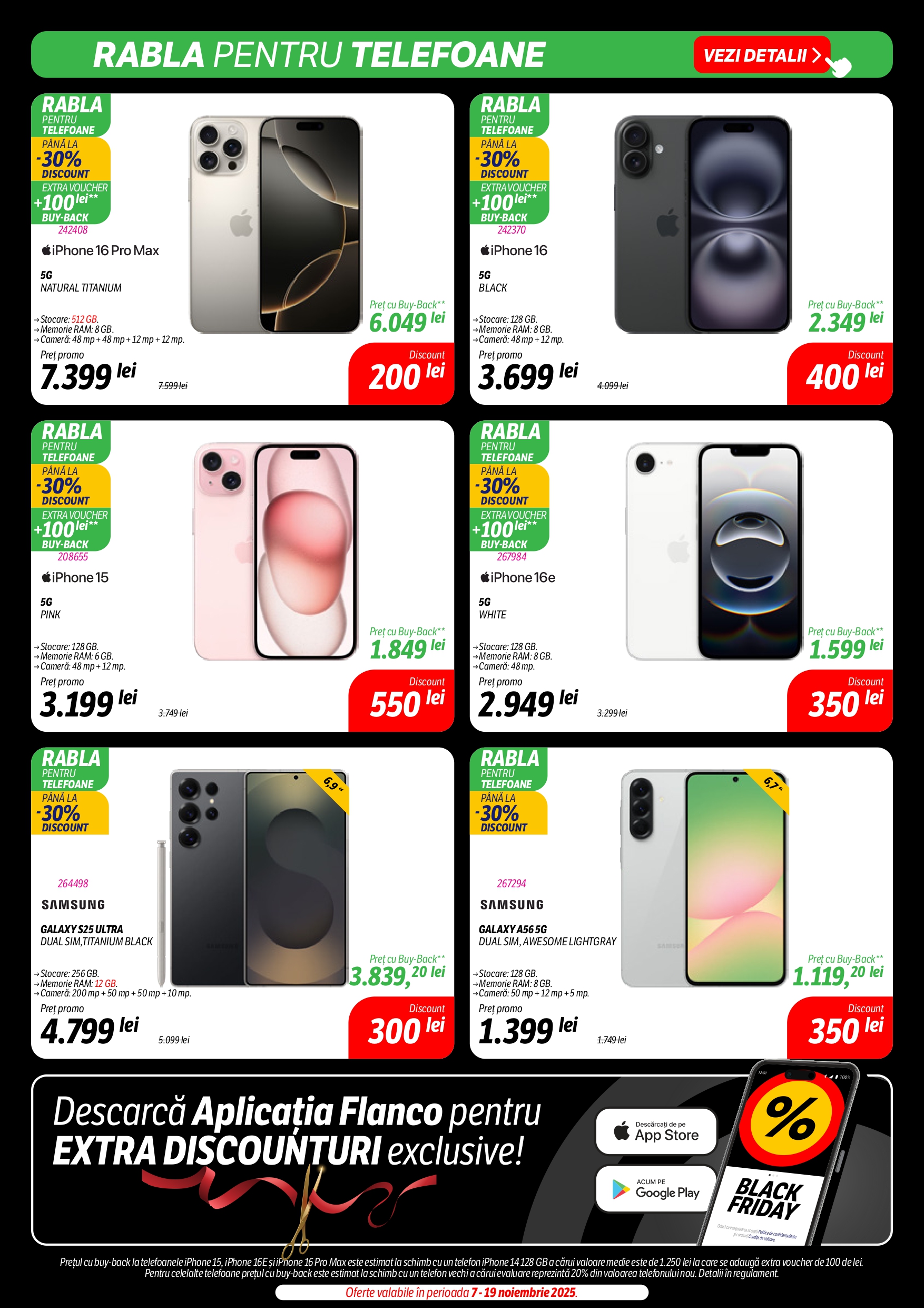 Un aspect important: unele reduceri sunt valabile doar până pe 10 noiembrie, în special cele de gaming sau din zona de electrocasnice mari. De asemenea, Flanco vine cu o opțiune interesantă pentru cei care aduc un produs vechi la schimb. E vorba despre un voucher Rabla de până la 300 lei, aplicabil în magazinele fizice, la diverse categorii: laptopuri, TV-uri, telefoane și electrocasnice mari.
