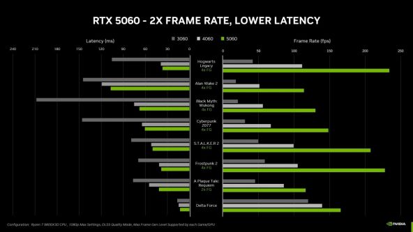 Noutățile interesante sunt suportul pentru DLSS 4 (inclusiv frame generation 4x) și noul Reflex 2, dar și NVENC/NVDEC actualizate. În gaming, NVIDIA spune că 5060 Ti e cu 20-25% mai rapidă decât 4060 Ti, iar 5060 e cam la fel peste 4060. Nu sunt cifre revoluționare, dar măcar se simte o diferență. Problema e că mare parte din aceste creșteri se bazează pe DLSS și frame generation, nu pe performanță brută.