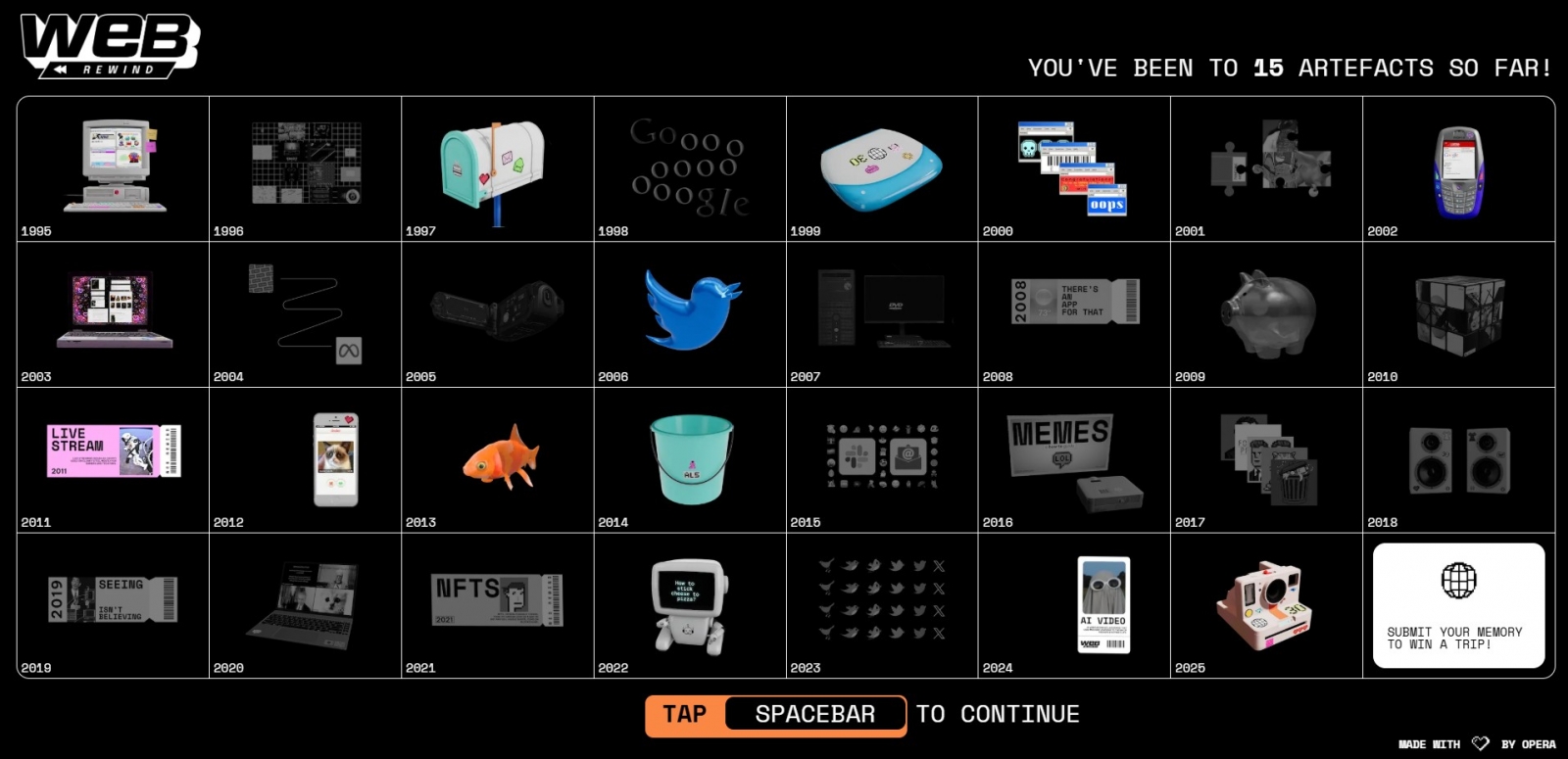 Opera marchează 30 de ani de existență printr-un proiect simpatic. E vorba despre Web Rewind, disponibil la adresa https://web-rewind.com/. E o experiență interactivă care ne „plimbă” prin momentele definitorii ale internetului din ultimii 30 de ani. Personal îl consider un mic „muzeu digital” al internetului, care prezintă istoria web prin meme-uri și trend-uri ambalate într-o prezentare „jucăușă”. Există și un concurs despre care discutăm în rândurile ce urmează!