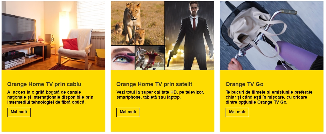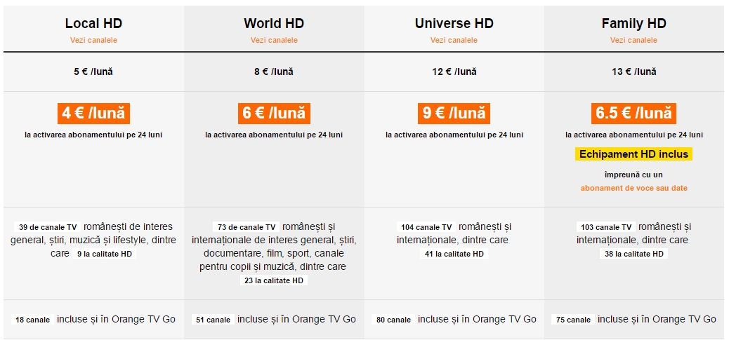 Utilizatorii vor putea alege din 3 pachete de bază - Analog, Explore și Global - și 5 opțiuni extra (HBO, Maxpack). Aceste pachet includ de la 51 la 121 canale TV și au prețuri standard între 6 și 9 euro pentru clienții Orange abonați la serviciile mobile. Nu în ultimul rând, există și Orange Home Fix - serviciul de voce fixă prin care se oferă 100 minute naționale, și 100 minute în rețea (lunar), pentru doar 1.25 euro taxă lunară.