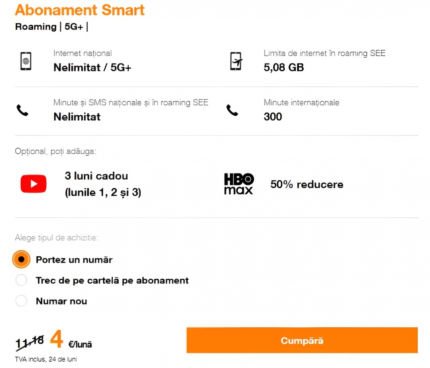 Partea bună e că oferta nu e o „promoție de 3 luni” sau ceva cu valabilitate scurtă. Orange specifică clar că prețul de 4 euro/lună rămâne fix pe întreaga durată contractuală – adică 24 de luni. Niciun cost suplimentar ascuns, nicio majorare după un timp. Și da, ai nevoie de portare pentru a beneficia de ofertă – deci e valabilă doar dacă vii din altă rețea.
