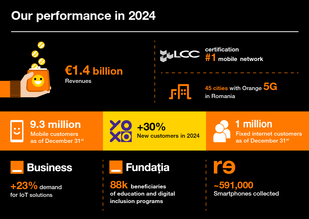Orange Româniaa raportat pentru 2024 o cifră de afaceri de 1,416 miliarde de euro, în scădere cu 8,5% față de anul anterior. În ultimul trimestru al anului, veniturile au fost de 367 de milioane de euro, în scădere cu 9,8% față de T4 2023. În ciuda acestor rezultate, operatorul susține că și-a menținut poziția de lider pe segmentul serviciilor mobile și fixe, având la finalul anului 9,3 milioane de utilizatori pentru telefonie mobilă, 1 milion pentru internet fix și tot atâția pentru televiziune.