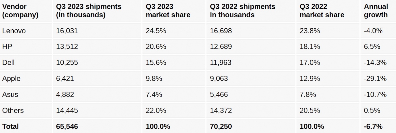 Apple înregistrează o scădere dramatică de 29% față de anul trecut și nici DELL nu stă prea bine cu 14.3%. Ceea ce se întâmplă e cumva normal, oamenii preferă să își upgradeze PC-ul ocazional, iar laptopurile se schimbă mai rar.