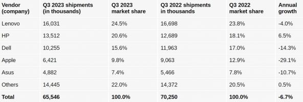 Declinul la nivel de vânzări continuă, dar parcă diferența anuală nu mai e atât de mare. Vorbim despre o scădere cu 6.7% a numărului de vânzări față de anul trecut. În perioada iulie-septembrie 2023 au fost vândute 65.5 milioane de PC-uri și laptopuri, iar Lenovo rămâne lider pe această nișă. Compania a înregistrat o scădere de 4% la nivel de vânzări, însă, doar HP, compania de pe locul 2, având o creștere de 6.5% de la an la an.