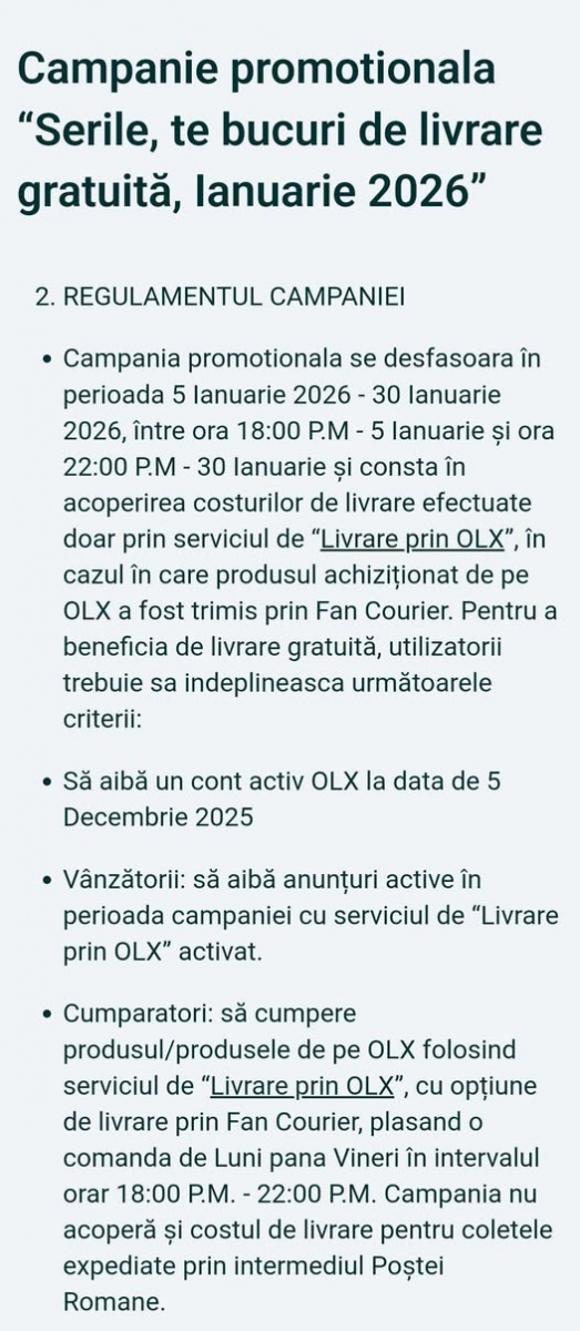Totul funcționează pe bază de conturi active. Practic, trebuie să fi avut un cont OLX activ încă din 5 decembrie 2025 ca să ai parte de această promoție. Vânzătorii, la rândul lor, trebuie să aibă anunțuri active cu livrarea prin OLX bifată. Iar coletul trebuie trimis cu Fan Courier, nu cu Poșta Română, altfel nu e valabilă oferta.