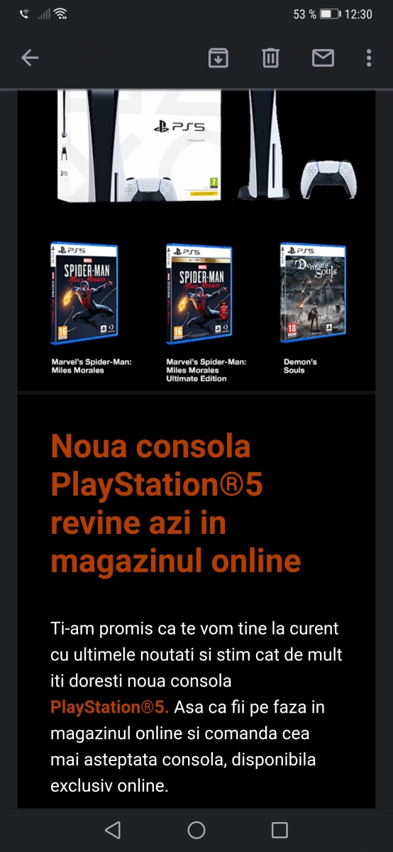 PlayStation 5 este cu siguranță cel mai căutat produs al finalului de an 2020, o consolă lansată la mijloc de lună noiembrie la noi în România și foarte greu de procurat din cauza stocurilor reduse. Am văzut cum unii retaileri au aplicat la tombole speciale pentru a oferi șansa celor norocoși de a achiziționa noua consolă. Chiar azi dimineață am aflat că PS5 a revenit în stocul eMAG pentru puțin timp, iar acum descoperim prin intermediul unui comentariu postat pe GadgetZone.ro faptul că PS5 va reveni azi și în magazinul online Orange.