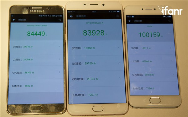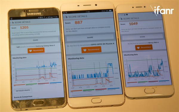 Cei de la Ifanr au comparat Meizu Pro 6 cu Samsung Galaxy Note 5 cu procesor Exynos 7420 la bord, dar şi cu Oppo R9 Plus, cu procesorul Snapdragon 652 integrat. Totul a început cu un test AnTuTu 6.1.3, care prezenta rezultate bune pentru Meizu Pro 6, ce îşi depăşea rivalii cu 16.000 sau 17.000 de puncte, ajungând la 100.159 puncte.