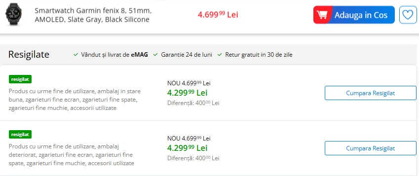 Smartwatch-ul Garmin fenix 8, varianta de 51mm cu ecran AMOLED, poate fi cumpărat acum resigilat de la eMAG la 4.299 lei, adică cu 400 lei mai puțin decât modelul nou.