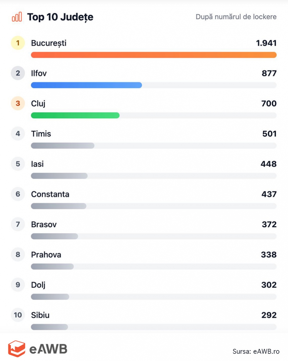 La nivel de județe, Bucureștiul conduce detașat în ceea ce privește numărul de lockere active, urmat de județele cu aglomerări urbane semnificative: