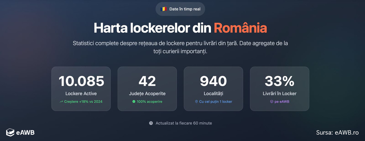 Potrivit datelor centralizate de eAWB – un marketplace de curierat care integrează toți marii operatori din piață – România a ajuns la un total de 10.085 lockere active în 2025, cu 33% mai multe față de anul precedent. Infrastructura acoperă toate cele 42 de județe și se regăsește în 940 de localități.