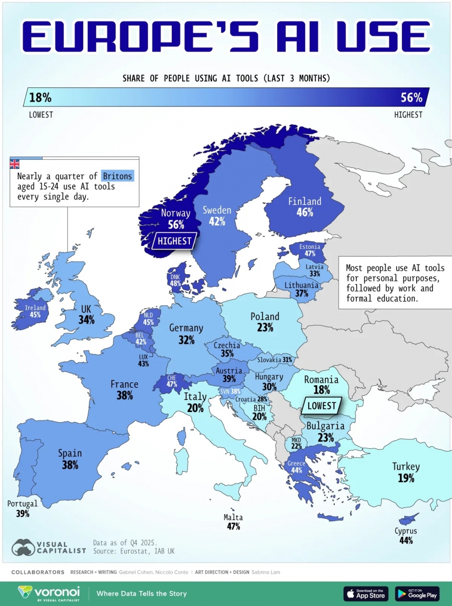 La polul opus, țările din nordul Europei conduc detașat clasamentul. Norvegia ocupă primul loc, cu peste 56% dintre persoane care au utilizat AI recent. Danemarca, Elveția și Estonia depășesc și ele pragul de 45%, iar Finlanda, Irlanda și Țările de Jos confirmă tendința: în aceste state, inteligența artificială a devenit deja parte din viața digitală de zi cu zi.