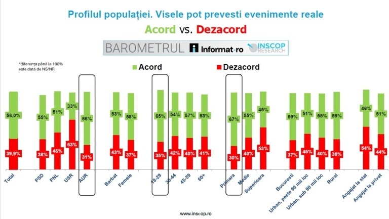 Ce-i și mai bizar: 56% cred că visele pot prevesti viitorul. Și aici lucrurile devin confuze, întrucât majoritatea care cred asta sunt tot tineri între 18 și 29 de ani, cu educație primară. Deși 94,5% spun că n-ar participa la practici de genul numerologie, tarot sau reiki, când sunt întrebați dacă ar apela la astfel de metode la insistențele unui apropiat, 8% admit că da.