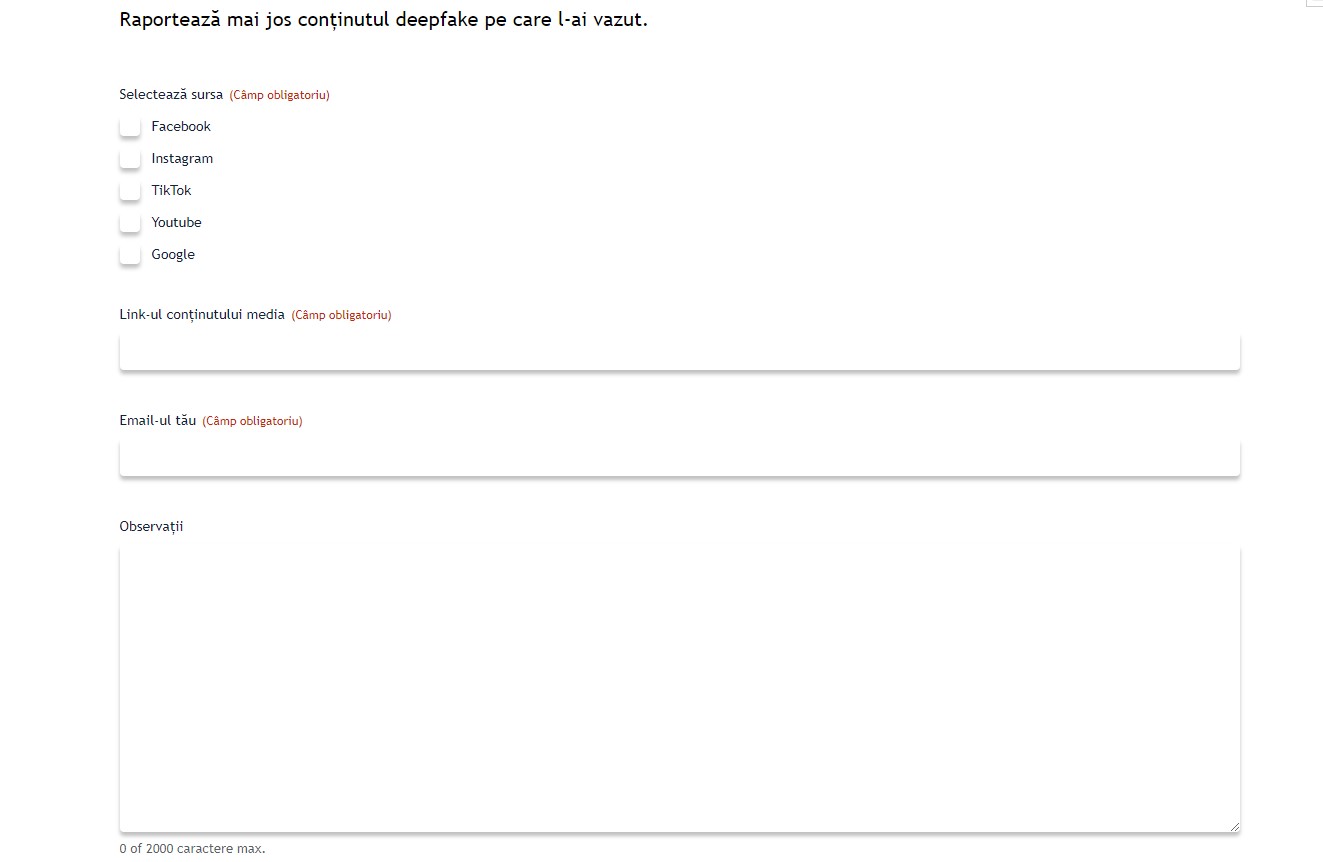 - realizarea unui formular de contact pe pagina de internet a Ministerului Cercetării, Inovării și Digitalizării, unde se pot încărca sesizări cu privire la conținutul audio/video manipulat digital în scopuri malițioase și care este distribuit pe platforme online de socializare, streaming și motoare de căutare online;