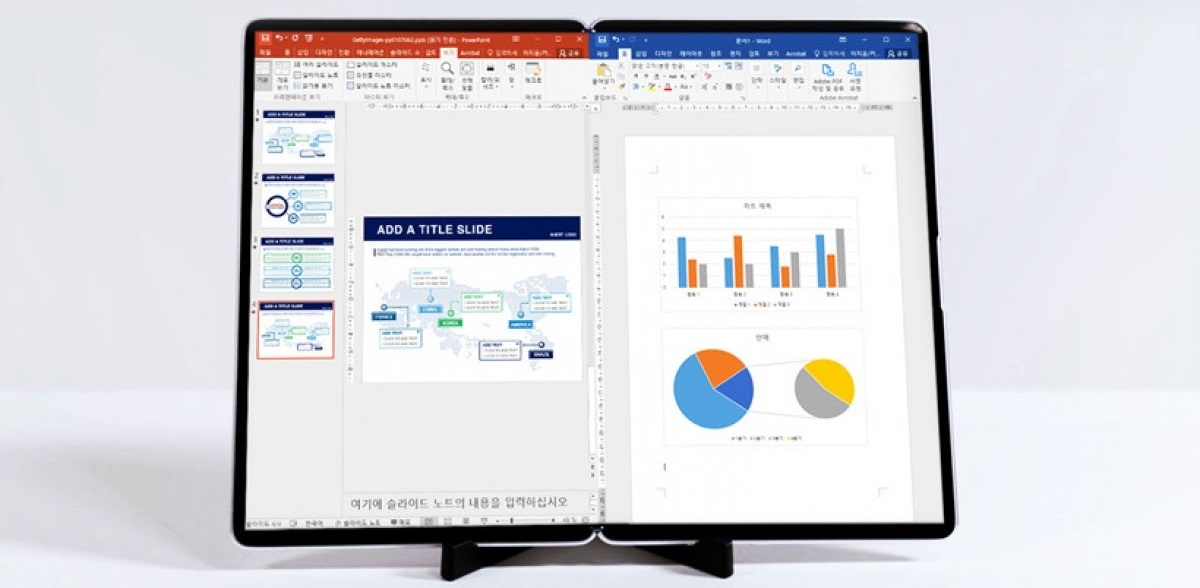 În varianta standard prototipul Samsung arată că orice telefon normal, dar cu o apăsare de buton, ecranul se extinde cu câţiva milimetri, oferind extra spaţiu de consum video. Samsung a mai prezentat şi un ecran pliabil de 17 inch, care se pliază pe jumătate, în stil Microsoft Surface Neo. Are aspect 4:3 şi e gândit special pentru productivitate. Poate fi folosit în orientări portret sau landscape.