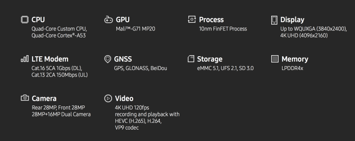 Producătorul sud coreean afirma că noul SoC oferă o creştere de performanţă de 27% faţă de predecesorul său direct, dar şi consuma cu 40% mai puţină energie faţă de un chipset bazat pe proces de 14 nm. Exynos 8895 e bazat pe 4 core-uri custom Samsung de noua generaţie, plus 4 core-uri Cortex A53. E inclusă aici şi tehnologia SCI (Samsung Coherent Interconnect), care permite realizarea unor sarcini complexe legate de deep learning sau AI.